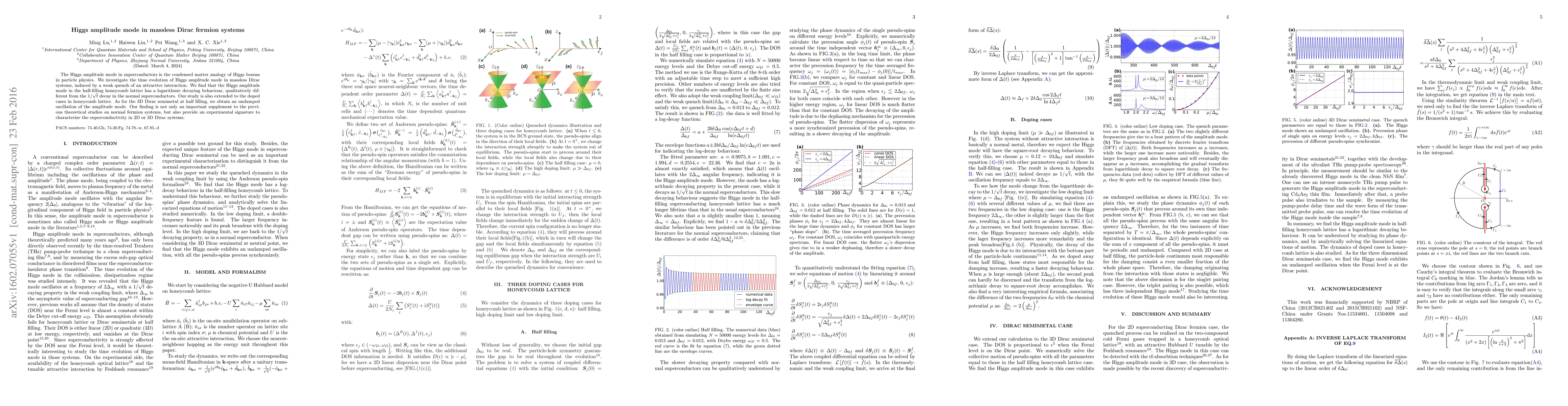This paper investigates the Higgs amplitude mode in massless Dirac fermion systems, revealing a logarithmic decay in half-filling honeycomb lattices, contrasting with the $1/\sqrt{t}$ decay in normal superconductors. It also finds undamped oscillations in 3D Dirac semimetals, offering new insights into superconductivity characterization in Dirac systems.