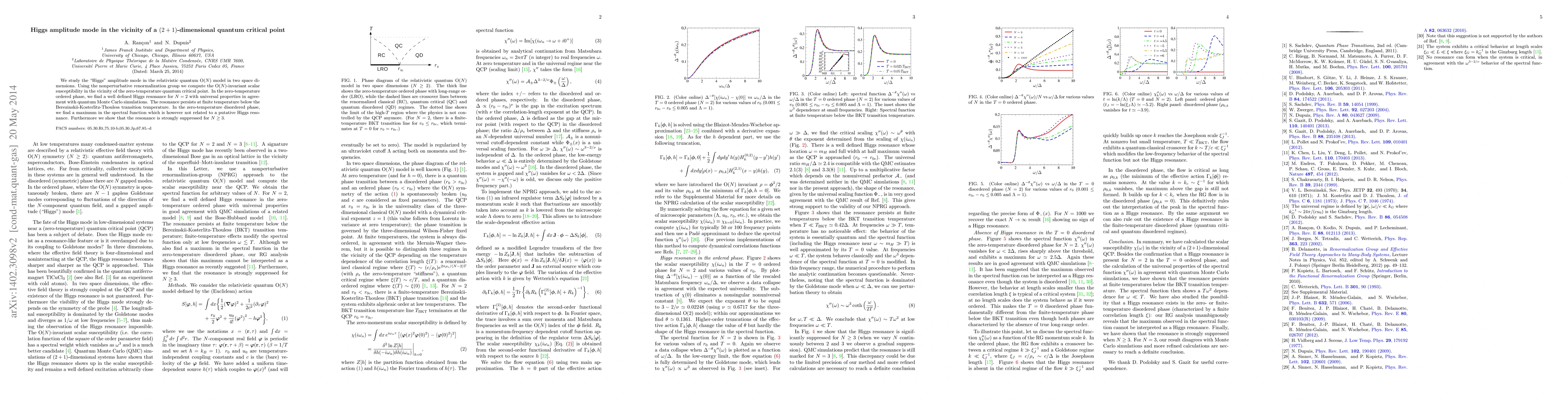 This paper investigates the "Higgs" amplitude mode in the $(2+1)$-dimensional quantum O($N$) model near a critical point, finding a well-defined Higgs resonance for $N=2$ that persists at finite temperatures. The resonance is strongly suppressed for $N\geq 3$ and absent in the disordered phase.