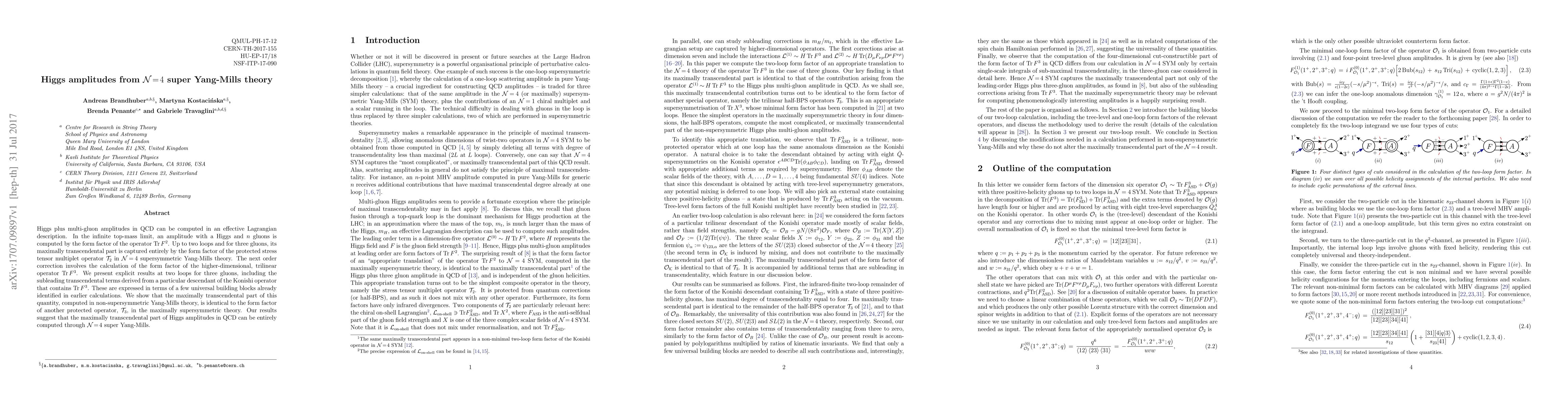 Higgs plus multi-gluon amplitudes in QCD can be computed in an effective Lagrangian description. In the infinite top-mass limit, an amplitude with a Higgs and $n$ gluons is computed by the form factor of the operator ${\rm Tr}\, F^2$. Up to two loops and for three gluons, its maximally transcendental part is captured entirely by the form factor of the protected stress tensor multiplet operator $\mathcal{T}_2$ in $\mathcal{N}=4$ supersymmetric Yang-Mills theory. The next order correction involves the calculation of the form factor of the higher-dimensional, trilinear operator ${\rm Tr}\, F^3$. We present explicit results at two loops for three gluons, including the subleading transcendental terms derived from a particular descendant of the Konishi operator that contains ${\rm Tr}\, F^3$. These are expressed in terms of a few universal building blocks already identified in earlier calculations. We show that the maximally transcendental part of this quantity, computed in non-supersymmetric Yang-Mills theory, is identical to the form factor of another protected operator, $\mathcal{T}_3$, in the maximally supersymmetric theory. Our results suggest that the maximally transcendental part of Higgs amplitudes in QCD can be entirely computed through $\mathcal{N}=4$ super Yang-Mills.