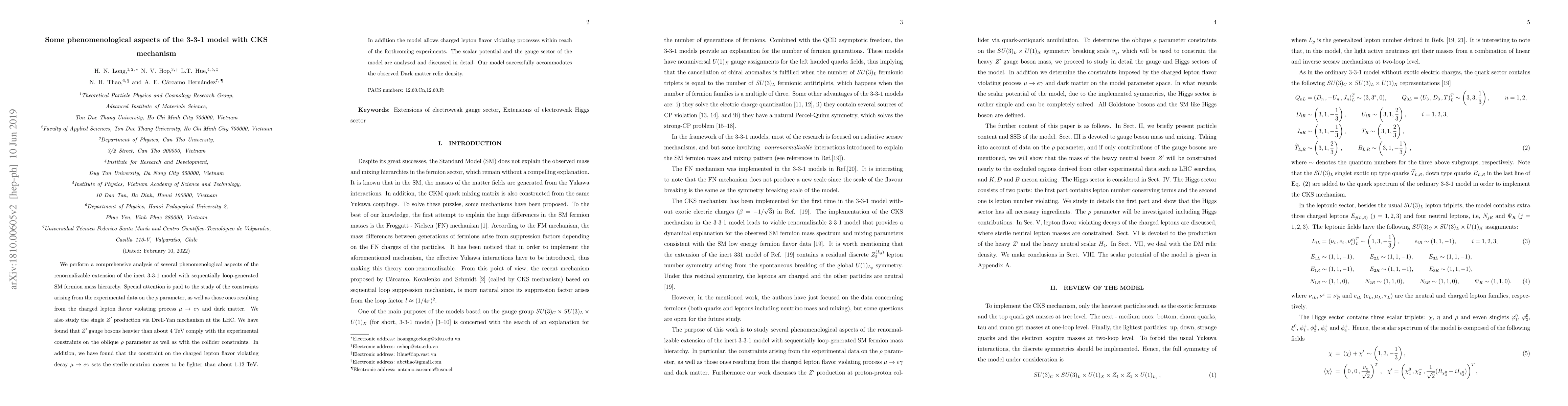 We perform a comprehensive analysis of several phenomenological aspects of the renormalizable extension of the inert 3-3-1 model with sequentially loop-generated SM fermion mass hierarchy. Special attention is paid to the study of the constraints arising from the experimental data on the $\rho$ parameter, as well as those ones resulting from the charged lepton flavor violating process $\mu\to e\gamma$ and dark matter. We also study the single $Z'$ production via Drell-Yan mechanism at the LHC. We have found that $Z'$ gauge bosons heavier than about $4$ TeV comply with the experimental constraints on the oblique $\rho$ parameter as well as with the collider constraints. In addition, we have found that the constraint on the charged lepton flavor violating decay $\mu\rightarrow e\gamma$ sets the sterile neutrino masses to be lighter than about $1.12$ TeV. In addition the model allows charged lepton flavor violating processes within reach of the forthcoming experiments. The scalar potential and the gauge sector of the model are analyzed and discussed in detail. Our model successfully accommodates the observed Dark matter relic density.