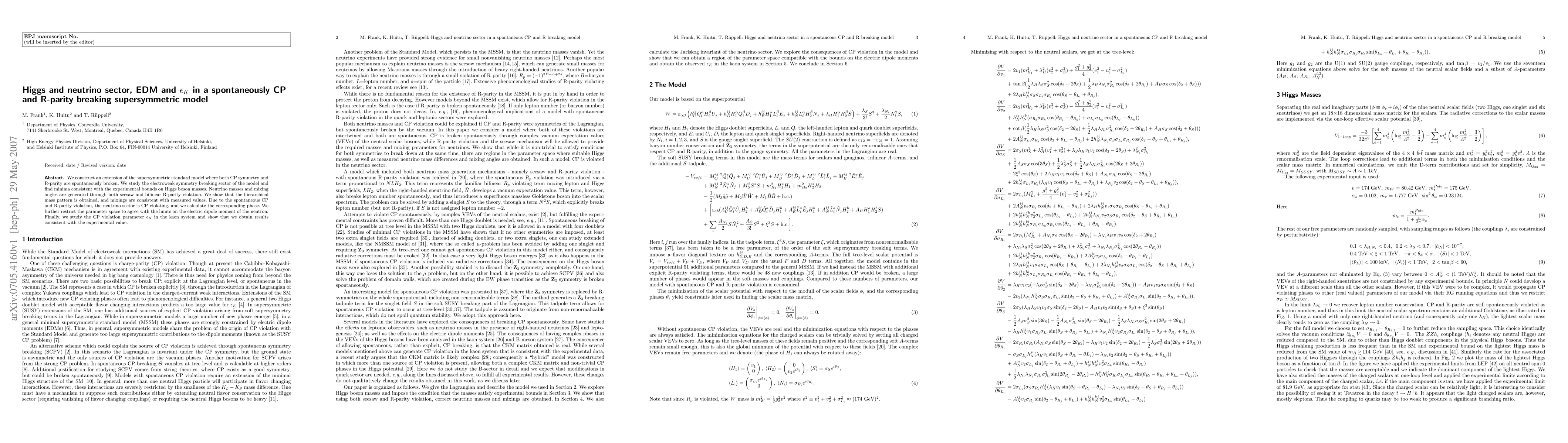 This paper constructs a supersymmetric model with spontaneous CP and R-parity breaking, generating neutrino masses via seesaw mechanisms and bilinear R-parity violation. It demonstrates consistency with experimental Higgs bounds, EDM limits, and CP violation parameters in the kaon system.