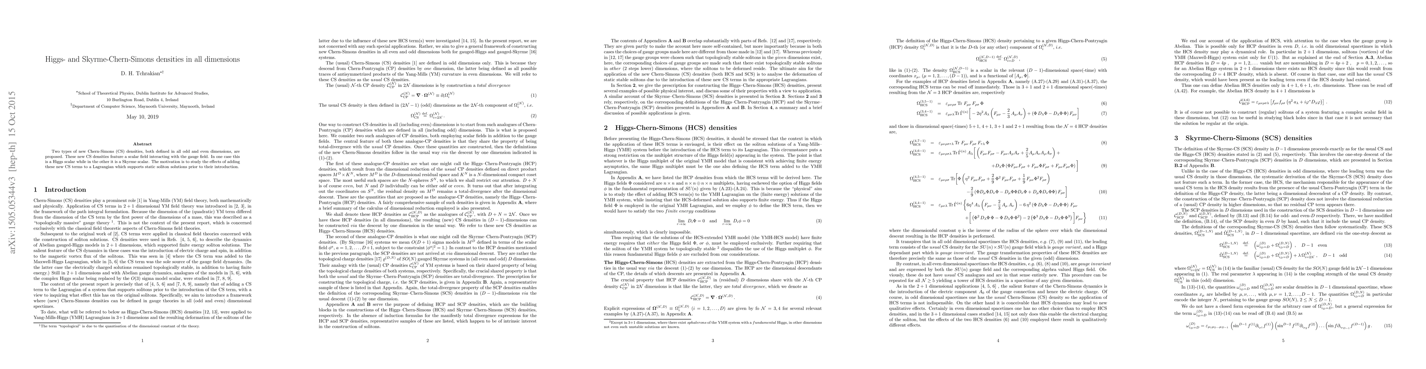 This paper proposes two new Chern-Simons densities in all dimensions, one involving a Higgs scalar and the other a Skyrme scalar, to examine their impact on a Lagrangian with static soliton solutions. The goal is to understand how these additional CS terms influence the system.