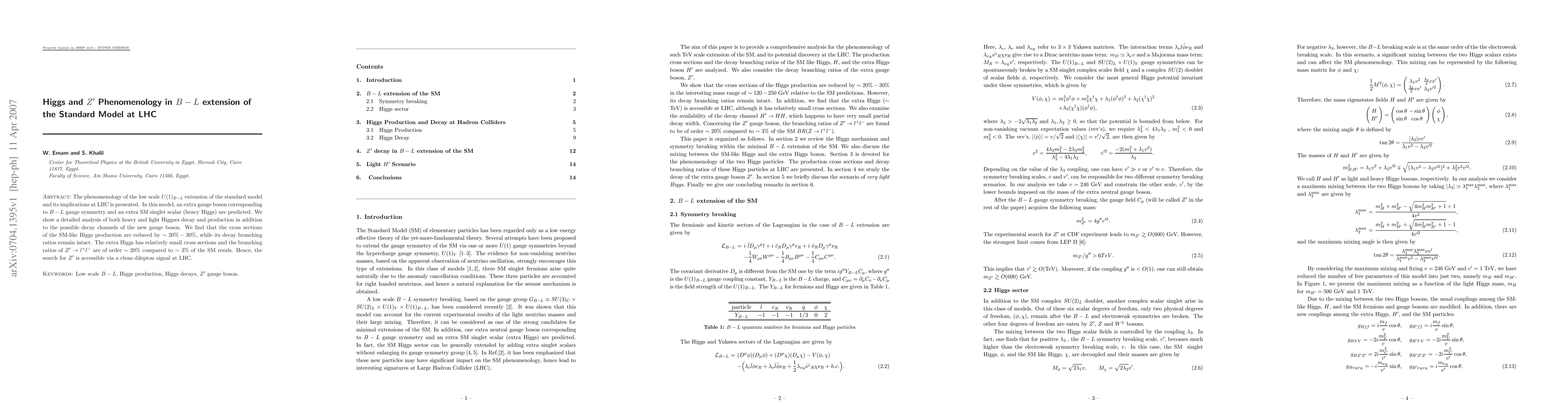 The phenomenology of the low scale U(1)_{B-L} extension of the standard model and its implications at LHC is presented. In this model, an extra gauge boson corresponding to B-L gauge symmetry and an extra SM singlet scalar (heavy Higgs) are predicted. We show a detailed analysis of both heavy and light Higgses decay and production in addition to the possible decay channels of the new gauge boson. We find that the cross sections of the SM-like Higgs production are reduced by ~ 20%-30%, while its decay branching ratios remain intact. The extra Higgs has relatively small cross sections and the branching ratios of Z'-> l^+ l^- are of order ~20% compared to ~ 3% of the SM resuls. Hence, the search for Z' is accessible via a clean dilepton signal at LHC.