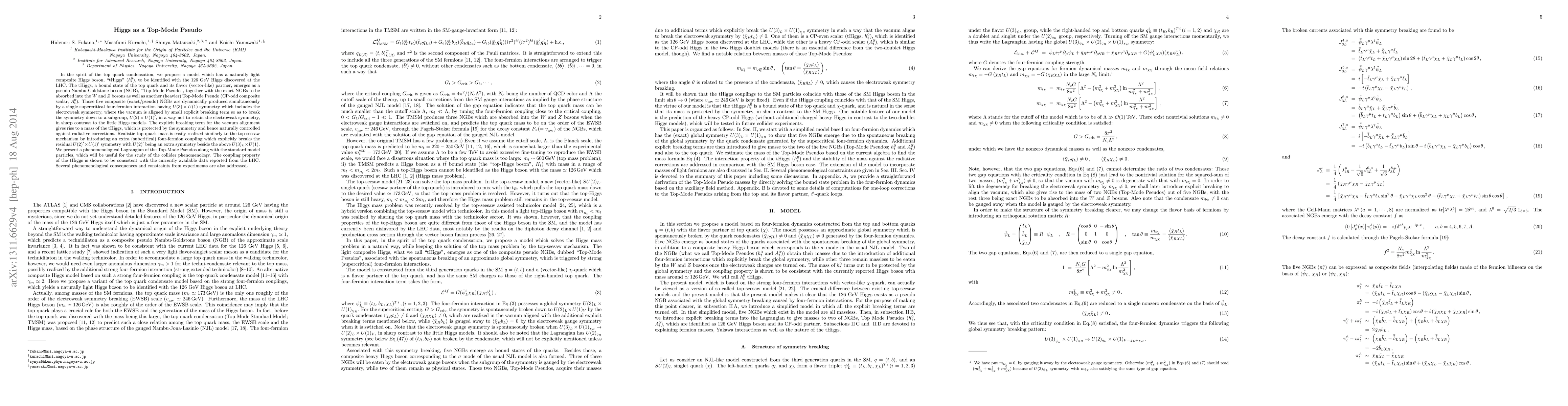 This paper proposes a model where the 126 GeV Higgs boson, identified as a "tHiggs," is a pseudo Nambu-Goldstone boson emerging from top quark condensation. The tHiggs, along with other composite NGBs, arises from a supercritical four-fermion interaction, offering a naturally light Higgs and consistent coupling properties with LHC data.