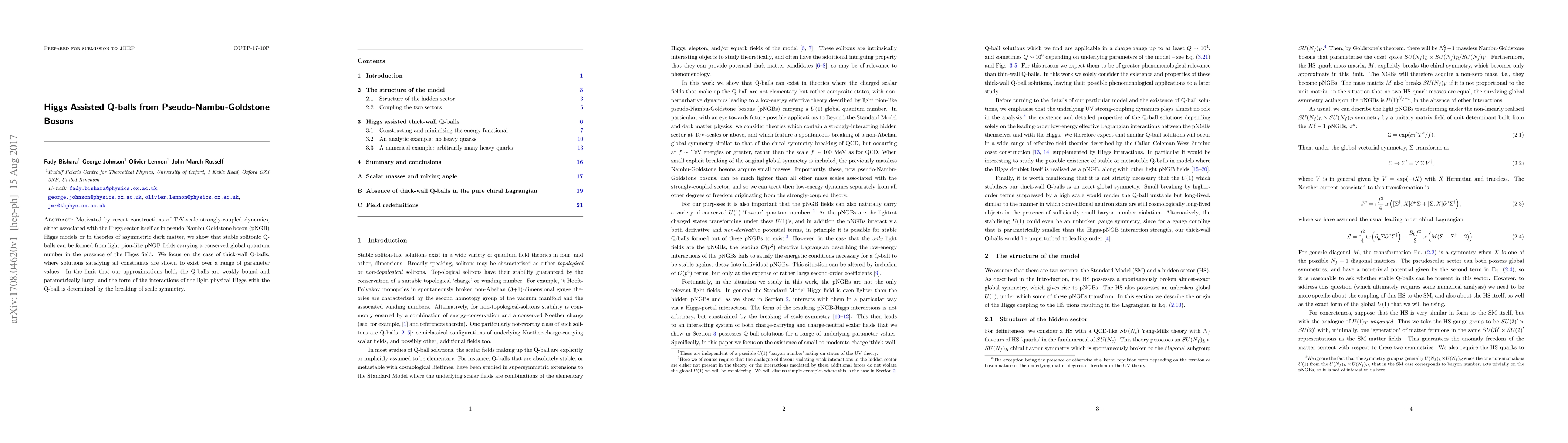 This paper proposes the formation of stable Q-balls from pseudo-Nambu-Goldstone bosons in the presence of the Higgs field, which can lead to new insights into TeV-scale strongly-coupled dynamics.