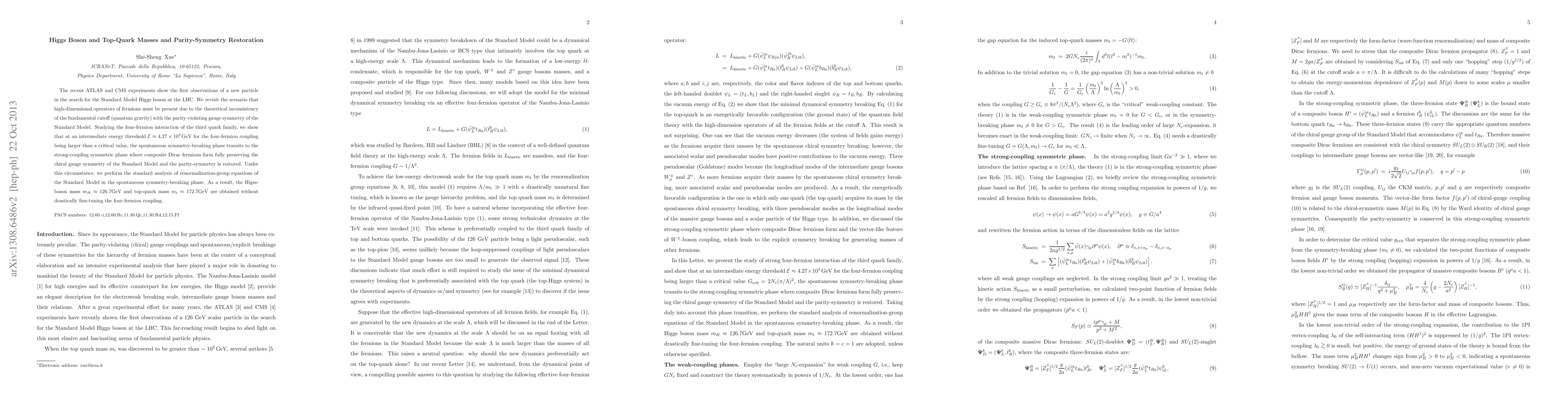 The recent ATLAS and CMS experiments show the first observations of a new particle in the search for the Standard Model Higgs boson at the LHC. We revisit the scenario that high-dimensional operators of fermions must be present due to the theoretical inconsistency of the fundamental cutoff (quantum gravity) with the parity-violating gauge symmetry of the Standard Model. Studying the four-fermion interaction of the third quark family, we show that at an intermediate energy threshold E\approx 4.27 TeV for the four-fermion coupling being larger than a critical value, the spontaneous symmetry-breaking phase transits to the strong-coupling symmetric phase where composite Dirac fermions form fully preserving the chiral gauge symmetry of the Standard Model and the parity-symmetry is restored. Under this circumstance, we perform the standard analysis of renormalization-group equations of the Standard Model in the spontaneous symmetry-breaking phase. As a result, the Higgs boson mass m_H\approx 126.7 GeV and top-quark mass m_t\approx 172.7 GeV are obtained without drastically fine-tuning the four-fermion coupling.