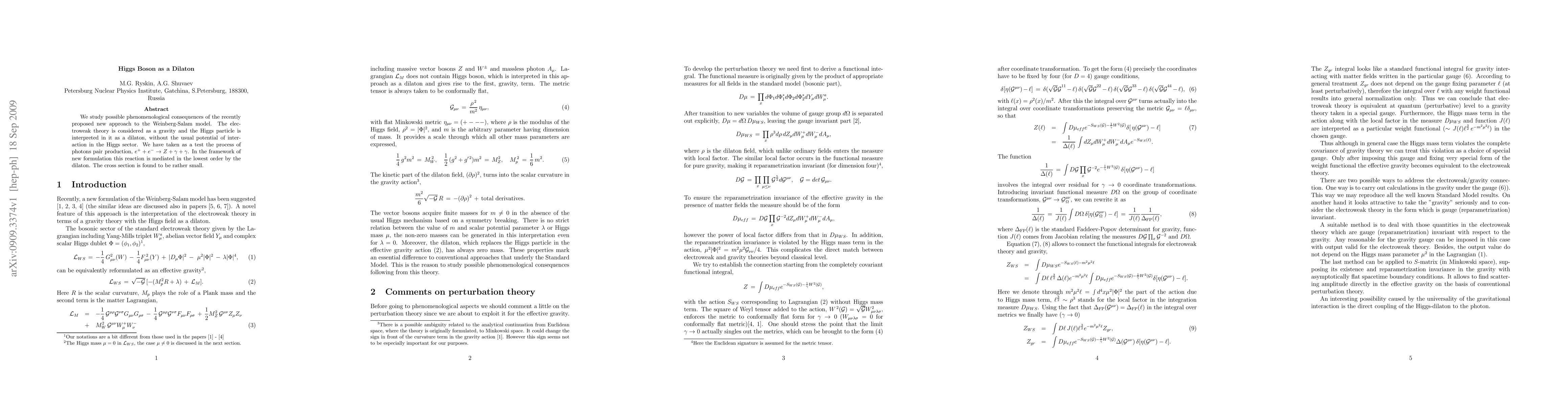 We study possible phenomenological consequences of the recently proposed new approach to the Weinberg-Salam model. The electroweak theory is considered as a gravity and the Higgs particle is interpreted in it as a dilaton, without the usual potential of interaction in the Higgs sector. We have taken as a test the process of photons pair production, $e^+ + e^- \to Z + \gamma + \gamma$. In the framework of new formulation this reaction is mediated in the lowest order by the dilaton. The cross section is found to be rather small.