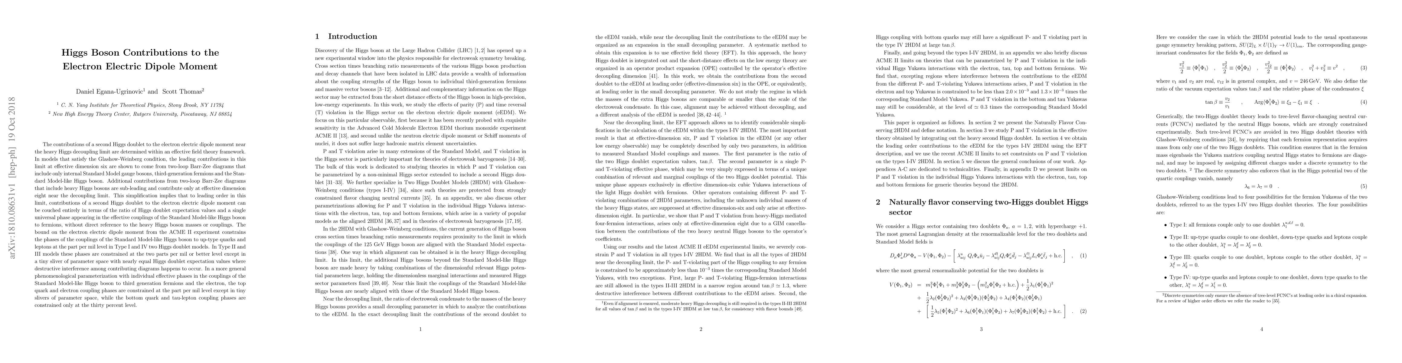 The contributions of a second Higgs doublet to the electron electric dipole moment near the heavy Higgs decoupling limit are determined within an effective field theory framework. In models that satisfy the Glashow-Weinberg condition, the leading contributions in this limit at effective dimension six are shown to come from two-loop Barr-Zee diagrams that include the Standard Model-like Higgs boson. Additional diagrams that include heavy Higgs bosons are sub-leading and contribute only at effective dimension eight near the decoupling limit. This simplification implies that to leading order in this limit, contributions of a second Higgs doublet to the electron electric dipole moment can be couched entirely in terms of the ratio of Higgs doublet expectation values and a single universal phase appearing in the effective couplings of the Standard Model-like Higgs boson to fermions, without direct reference to the heavy Higgs boson masses or couplings. The recent bound from the ACME II experiment constrains the phases of the couplings of the Standard Model-like Higgs boson to up-type quarks and leptons at the part per mil level in Type I and IV two Higgs doublet models. In Type II and III models these phases are constrained at the two parts per mil or better level except in a tiny sliver of parameter space with nearly equal Higgs doublet expectation values where destructive interference among contributing diagrams happens to occur. In a more general phenomenological parameterization with individual effective phases in the couplings of the Standard Model-like Higgs boson to third generation fermions and the electron, the top quark and electron coupling phases are constrained at the part per mil level except in tiny slivers of parameter space, while the bottom quark and tau-lepton coupling phases are constrained only at the thirty percent level.
