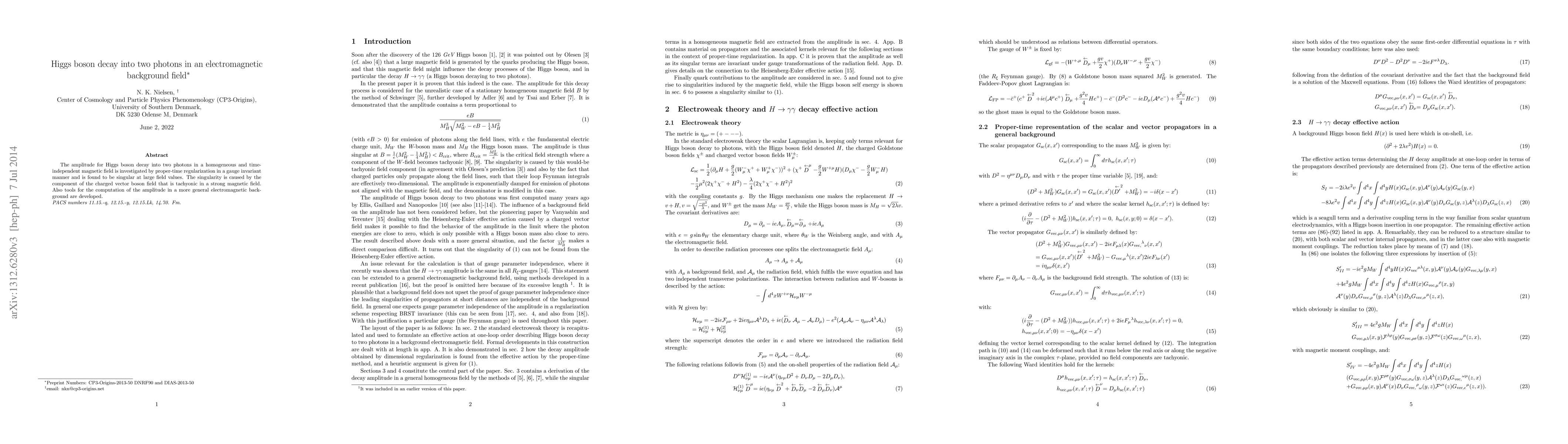 This paper investigates the decay of a Higgs boson into two photons under a strong, homogeneous magnetic field, revealing a singularity in the amplitude due to tachyonic charged vector bosons. Tools for computing this amplitude in more complex electromagnetic backgrounds are also developed.