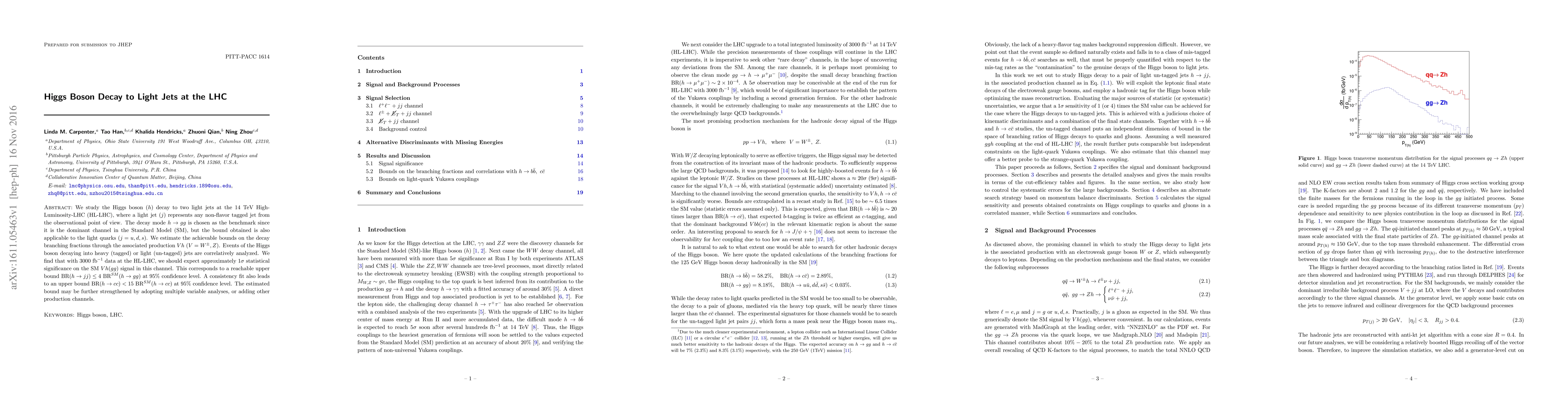 We study the Higgs boson $(h)$ decay to two light jets at the 14 TeV High-Luminosity-LHC (HL-LHC), where a light jet ($j$) represents any non-flavor tagged jet from the observational point of view. The decay mode $h\to gg$ is chosen as the benchmark since it is the dominant channel in the Standard Model (SM), but the bound obtained is also applicable to the light quarks $(j=u,d,s)$. We estimate the achievable bounds on the decay branching fractions through the associated production $Vh\ (V=W^\pm,Z)$. Events of the Higgs boson decaying into heavy (tagged) or light (un-tagged) jets are correlatively analyzed. We find that with 3000 fb$^{-1}$ data at the HL-LHC, we should expect approximately $1\sigma$ statistical significance on the SM $Vh(gg)$ signal in this channel. This corresponds to a reachable upper bound ${\rm BR}(h\to jj) \leq 4~ {\rm BR}^{SM}(h\to gg)$ at $95\%$ confidence level. A consistency fit also leads to an upper bound ${\rm BR}(h\to cc) < 15~ {\rm BR}^{SM}(h\to cc)$ at $95\%$ confidence level. The estimated bound may be further strengthened by adopting multiple variable analyses, or adding other production channels.