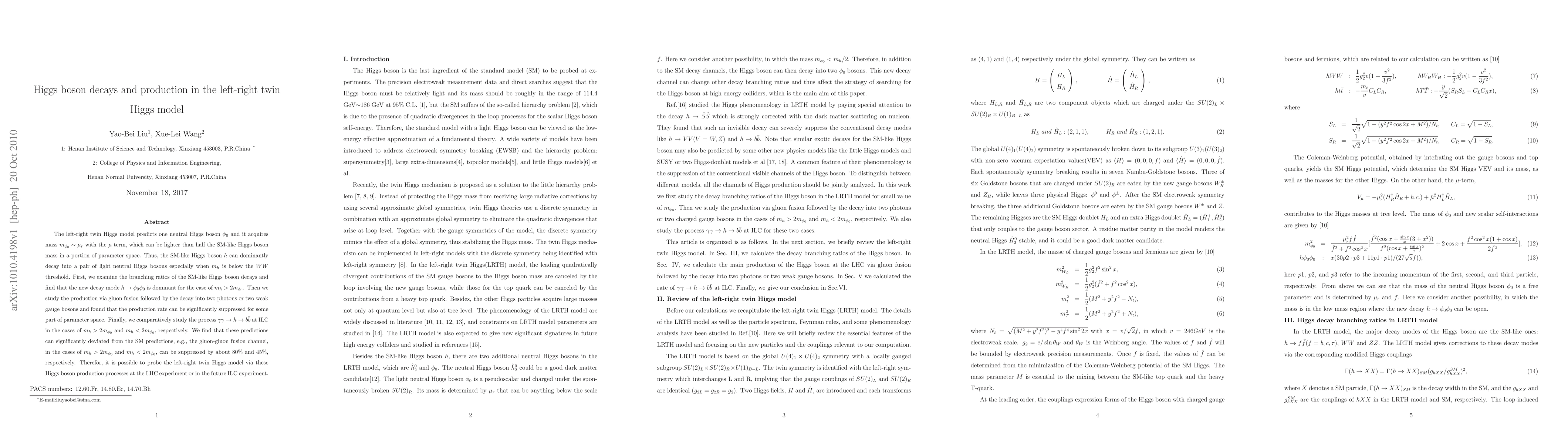 The left-right twin Higgs model predicts a lighter neutral Higgs boson $\phi_{0}$ that can dominate the decay of the SM-like Higgs boson $h$ into a pair of $\phi_{0}$ when $m_{h}$ is below the $WW$ threshold. The production rate of Higgs bosons via gluon fusion can be significantly suppressed, offering potential deviations from SM predictions that can be probed at the LHC or future ILC experiments.