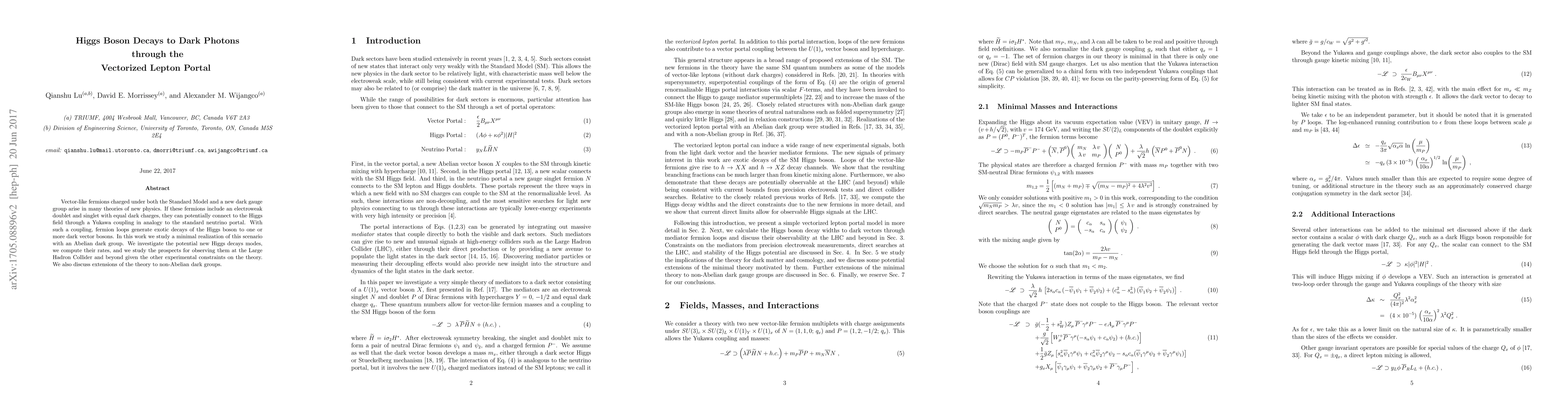 This paper explores Higgs boson decays to dark photons via a vectorized lepton portal, where vector-like fermions connect the Higgs field to dark gauge bosons. The study computes decay rates and assesses the potential for observing these new decay modes at the Large Hadron Collider, considering experimental constraints and theoretical extensions to non-Abelian dark groups.