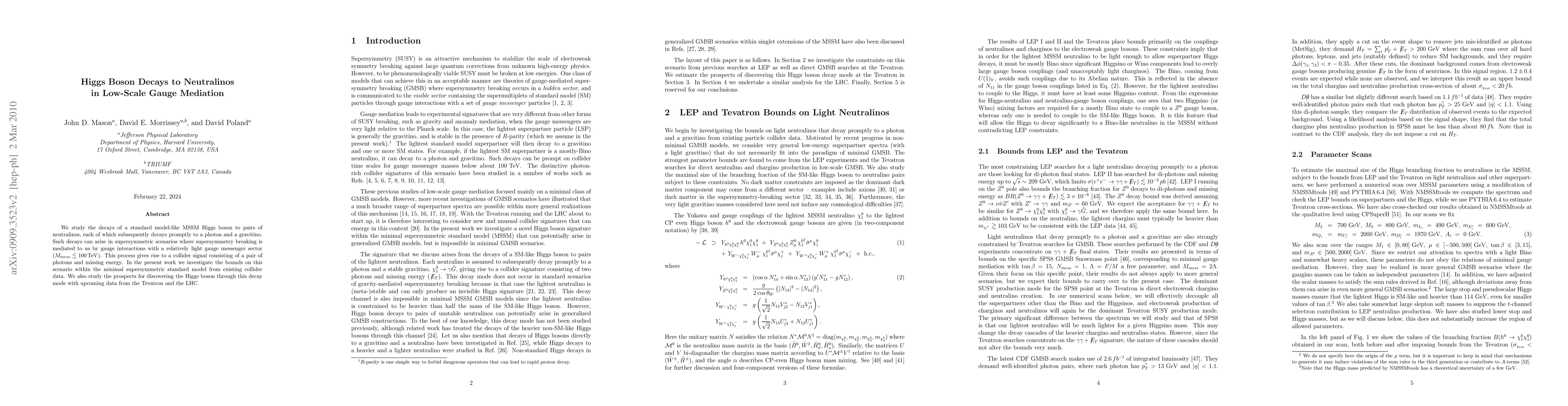 We study the decays of a standard model-like MSSM Higgs boson to pairs of neutralinos, each of which subsequently decays promptly to a photon and a gravitino. Such decays can arise in supersymmetric scenarios where supersymmetry breaking is mediated to us by gauge interactions with a relatively light gauge messenger sector (M_{mess} < 100 TeV). This process gives rise to a collider signal consisting of a pair of photons and missing energy. In the present work we investigate the bounds on this scenario within the minimal supersymmetric standard model from existing collider data. We also study the prospects for discovering the Higgs boson through this decay mode with upcoming data from the Tevatron and the LHC.
