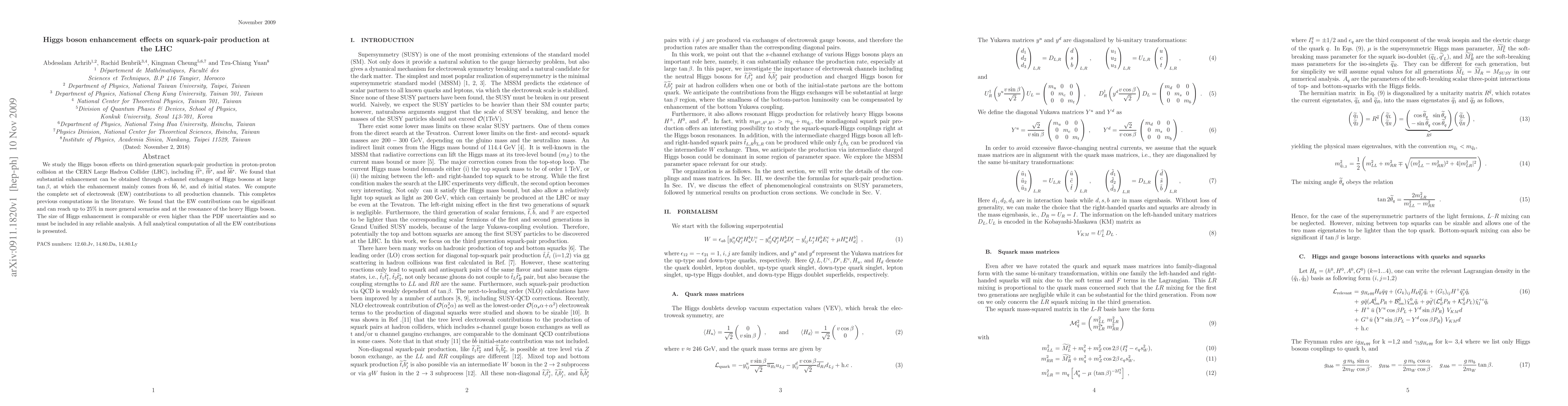 This paper investigates the impact of Higgs boson effects on third-generation squark-pair production at the LHC, revealing significant enhancements through s-channel exchanges at high $\tan\beta$. The study includes complete electroweak contributions, which can be up to 25% significant, emphasizing their importance in reliable analyses.