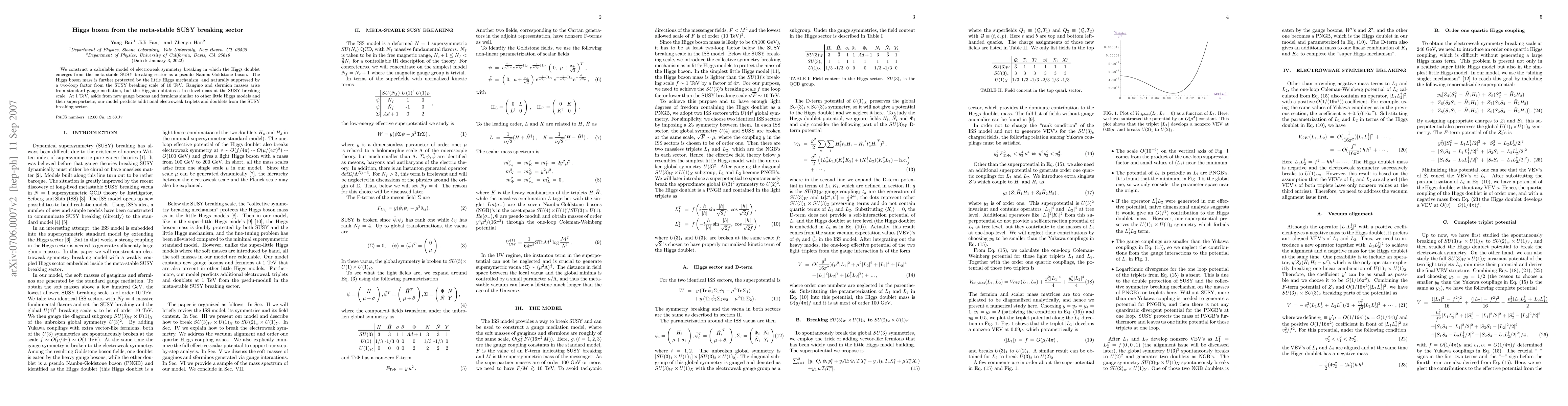 This paper proposes a model where the Higgs boson originates from a meta-stable SUSY breaking sector as a pseudo Nambu-Goldstone boson, with its mass protected by the little Higgs mechanism and suppressed by a two-loop factor. The model also predicts additional electroweak triplets and doublets at 1 TeV.