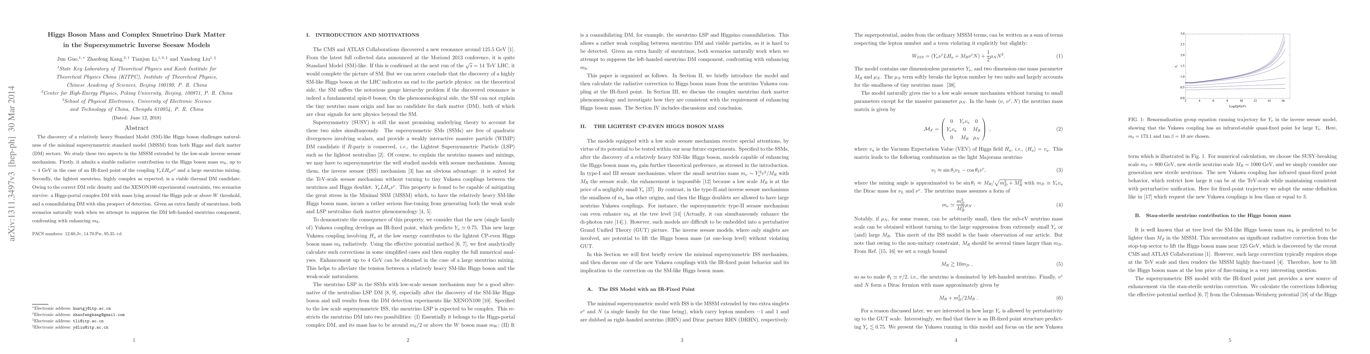 This paper explores the Higgs boson mass and complex sneutrino dark matter in supersymmetric inverse seesaw models, showing that a sizable radiative correction can enhance the Higgs mass and that the lightest sneutrino can serve as viable dark matter, with two surviving scenarios: Higgs-portal complex dark matter and coannihilating dark matter.
