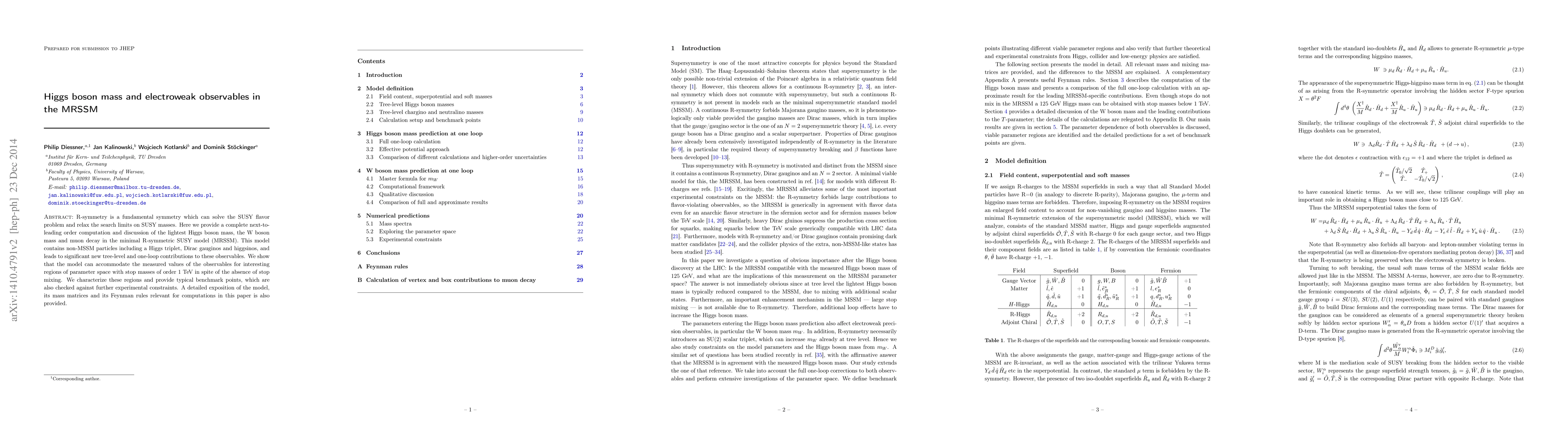 This paper computes next-to-leading order contributions to the Higgs boson mass, W boson mass, and muon decay in the minimal R-symmetric SUSY model (MRSSM), showing it can accommodate measured values despite the absence of stop mixing, with benchmark points in regions where stop masses are around 1 TeV. The study also provides a detailed exposition of the model's mass matrices and Feynman rules.