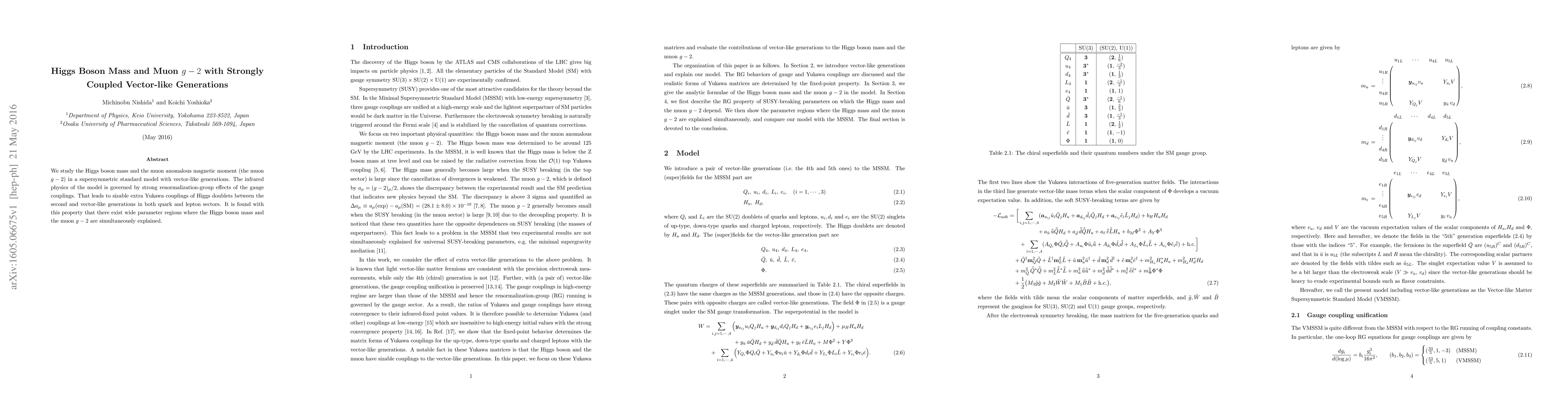 This paper explores the Higgs boson mass and muon anomalous magnetic moment within a supersymmetric model featuring vector-like generations, where strong renormalization-group effects generate significant Yukawa couplings. It finds parameter regions where both the Higgs mass and muon $g-2$ can be simultaneously explained.
