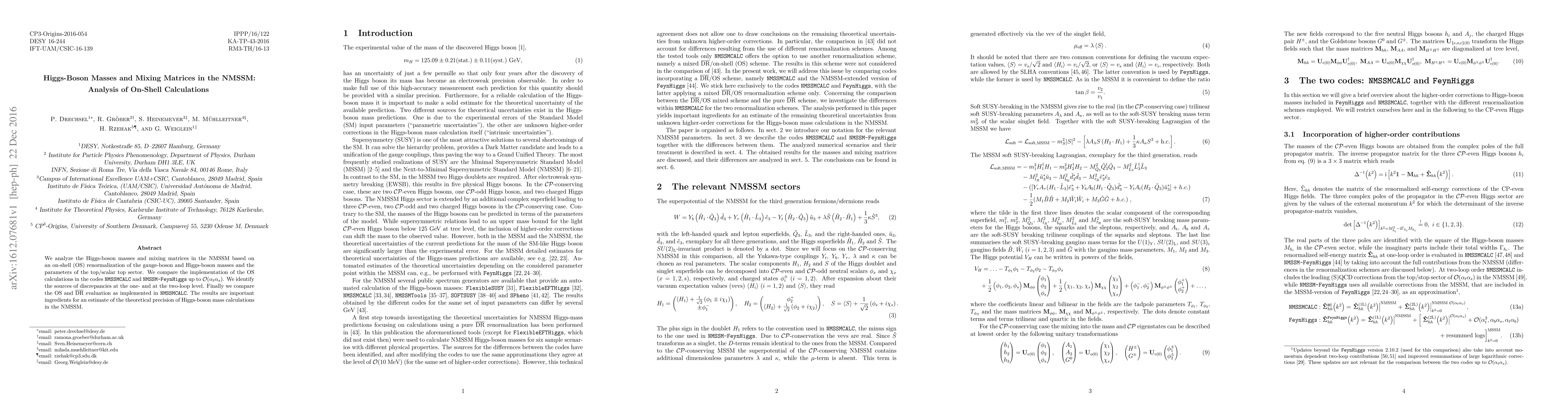 This paper analyzes Higgs-boson masses and mixing matrices in the Next-to-Minimal Supersymmetric Standard Model (NMSSM) using on-shell renormalization, comparing implementations in NMSSMCALC and NMSSM-FeynHiggs, and identifies discrepancies at one- and two-loop levels. The study also contrasts on-shell with $\overline{\text{DR}}$ evaluations in NMSSMCALC, essential for assessing theoretical precision in NMSSM Higgs calculations.