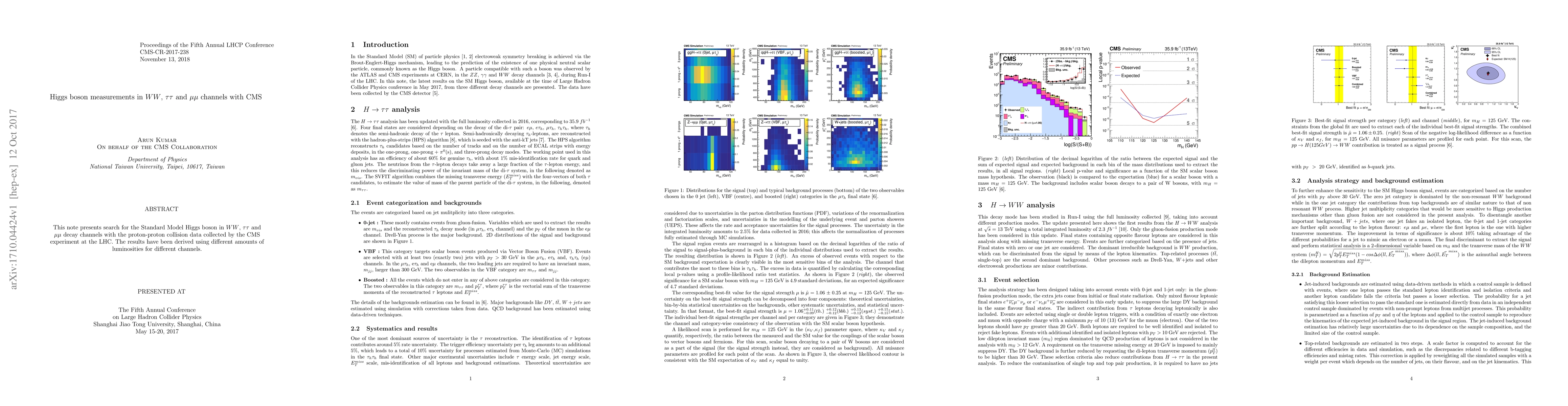 Summary: This paper reports on the search for the Standard Model Higgs boson in $WW$, $\tau\tau$, and $\mu\mu$ decay channels using data from the CMS experiment at the LHC, analyzing various luminosity levels for different channels.