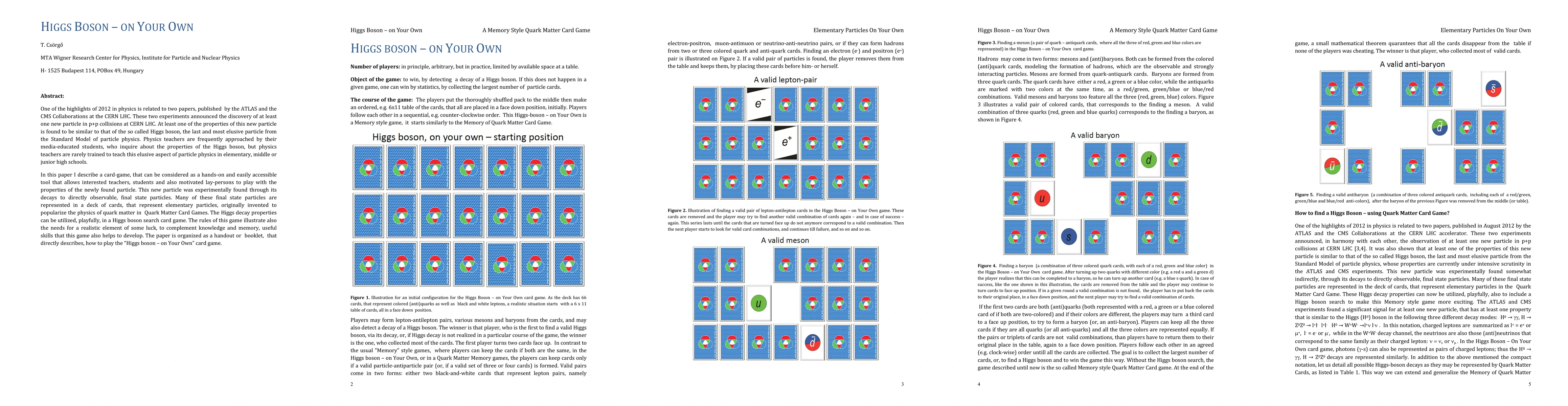 This paper introduces a card game designed to help teachers and students explore the properties of the newly discovered Higgs boson, using a deck of cards representing elementary particles. The game aims to make the complex physics of Higgs decay accessible and engaging, fostering both knowledge and skills like memory and luck.