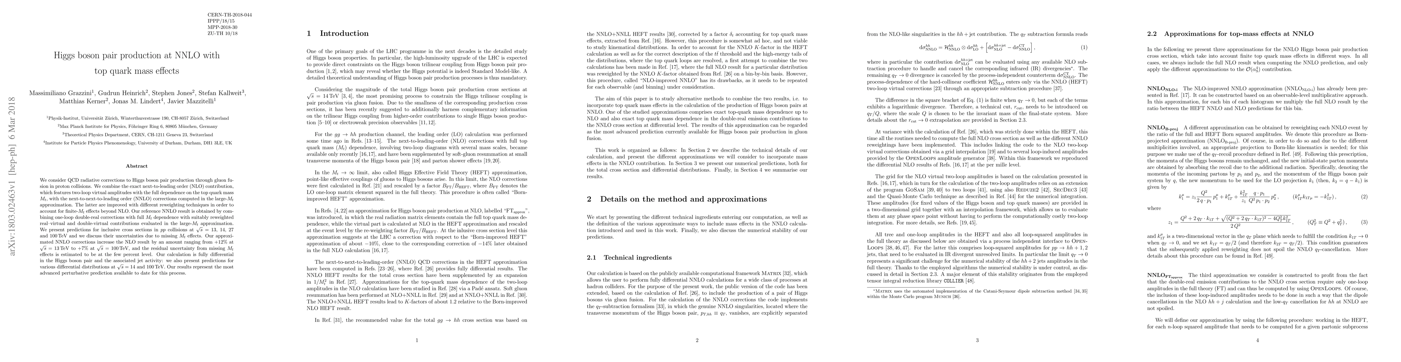 We consider QCD radiative corrections to Higgs boson pair production through gluon fusion in proton collisions. We combine the exact next-to-leading order (NLO) contribution, which features two-loop virtual amplitudes with the full dependence on the top quark mass $M_t$, with the next-to-next-to-leading order (NNLO) corrections computed in the large-$M_t$ approximation. The latter are improved with different reweighting techniques in order to account for finite-$M_t$ effects beyond NLO. Our reference NNLO result is obtained by combining one-loop double-real corrections with full $M_t$ dependence with suitably reweighted real--virtual and double-virtual contributions evaluated in the large-$M_t$ approximation. We present predictions for inclusive cross sections in $pp$ collisions at $\sqrt{s}$=13, 14, 27 and 100TeV and we discuss their uncertainties due to missing $M_t$ effects. Our approximated NNLO corrections increase the NLO result by an amount ranging from +12% at $\sqrt{s}$=13TeV to +7% at $\sqrt{s}$=100TeV, and the residual uncertainty from missing $M_t$ effects is estimated to be at the few percent level. Our calculation is fully differential in the Higgs boson pair and the associated jet activity: we also present predictions for various differential distributions at $\sqrt{s}$=14 and 100TeV. Our results represent the most advanced perturbative prediction available to date for this process.