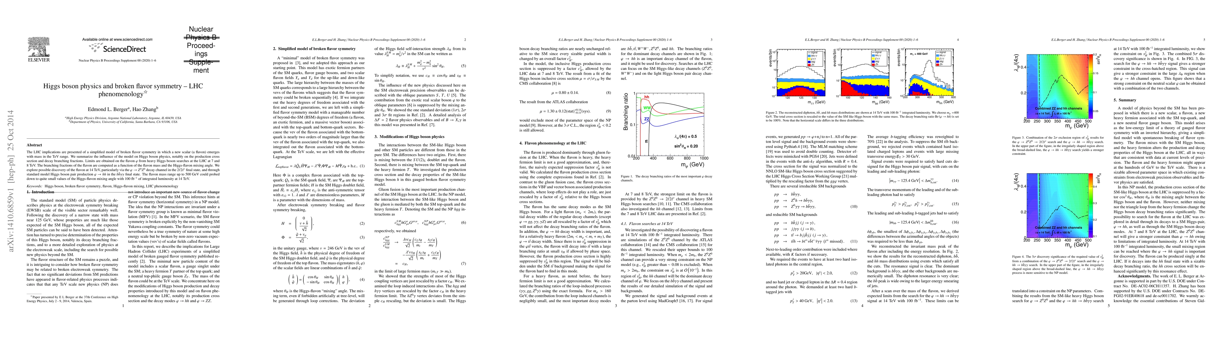 The LHC implications are presented of a simplified model of broken flavor symmetry in which a new scalar (a flavon) emerges with mass in the TeV range. We summarize the influence of the model on Higgs boson physics, notably on the production cross section and decay branching fractions. Limits are obtained on the flavon $\varphi$ from heavy Higgs boson searches at the LHC at 7 and 8 TeV. The branching fractions of the flavon are computed as a function of the flavon mass and the Higgs-flavon mixing angle. We explore possible discovery of the flavon at 14 TeV, particularly via the $\varphi \rightarrow Z^0Z^0$ decay channel in the $2\ell2\ell'$ final state, and through standard model Higgs boson pair production $\varphi \rightarrow hh$ in the $b\bar{b}\gamma\gamma$ final state. The flavon mass range up to $500$ GeV could probed down to quite small values of the Higgs-flavon mixing angle with 100 fb$^{-1}$ of integrated luminosity at 14 TeV.
