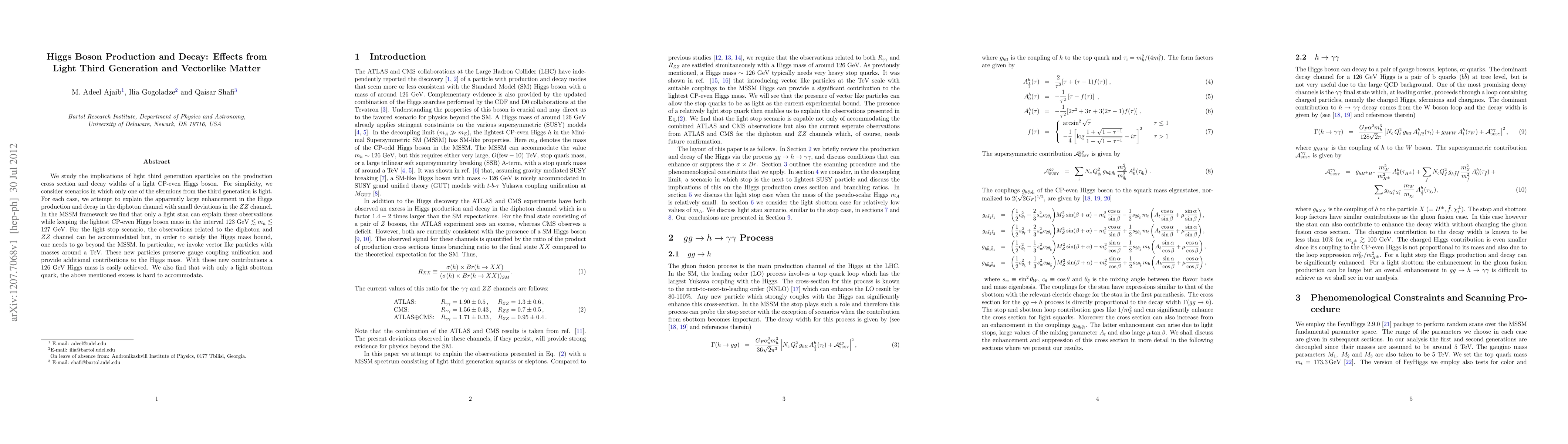 We study the implications of light third generation sparticles on the production cross section and decay widths of a light CP-even Higgs boson. For simplicity, we consider scenarios in which only one of the sfermions from the third generation is light. For each case, we attempt to explain the apparently large enhancement in the Higgs production and decay in the diphoton channel with small deviations in the ZZ channel. In the MSSM framework we find that only a light stau can explain these observations while keeping the lightest CP-even Higgs boson mass in the interval 123 GeV \lesssim m_h \lesssim 127 GeV. For the light stop scenario, the observations related to the diphoton and ZZ channel can be accommodated but, in order to satisfy the Higgs mass bound, one needs to go beyond the MSSM. In particular, we invoke vector like particles with masses around a TeV. These new particles preserve gauge coupling unification and provide additional contributions to the Higgs mass. With these new contributions a 126 GeV Higgs mass is easily achieved. We also find that with only a light sbottom quark, the above mentioned excess is hard to accommodate.