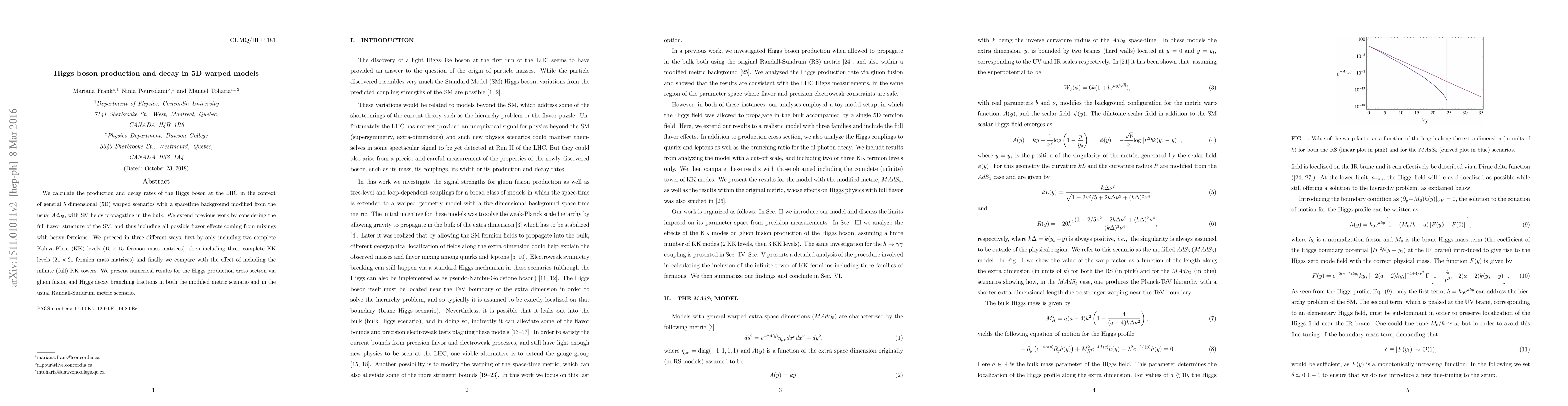 This paper investigates Higgs boson production and decay rates at the LHC in 5D warped models, extending previous work to include full SM flavor structure and various Kaluza-Klein levels. It compares results from modified and standard metric scenarios, highlighting differences in production cross sections and decay branching fractions.
