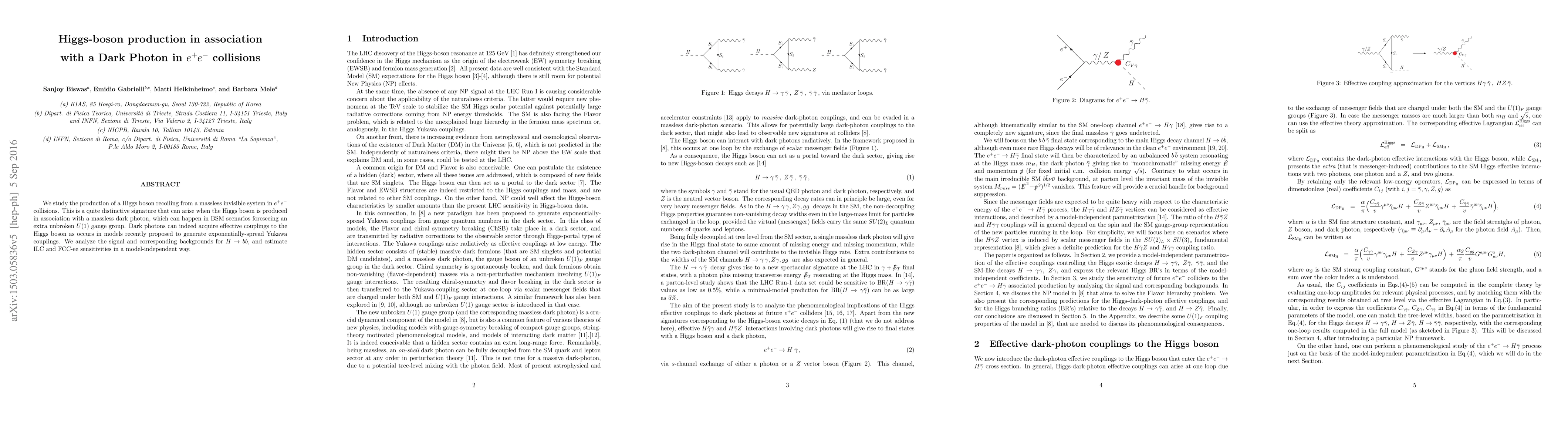 This paper investigates Higgs-boson production in association with a dark photon in $e^+ e^-$ collisions, focusing on a distinctive signature where a Higgs boson is produced alongside a massless dark photon in beyond-Standard-Model scenarios. The study estimates the International Linear Collider and Future Circular Collider-electron-electron sensitivities for this process.
