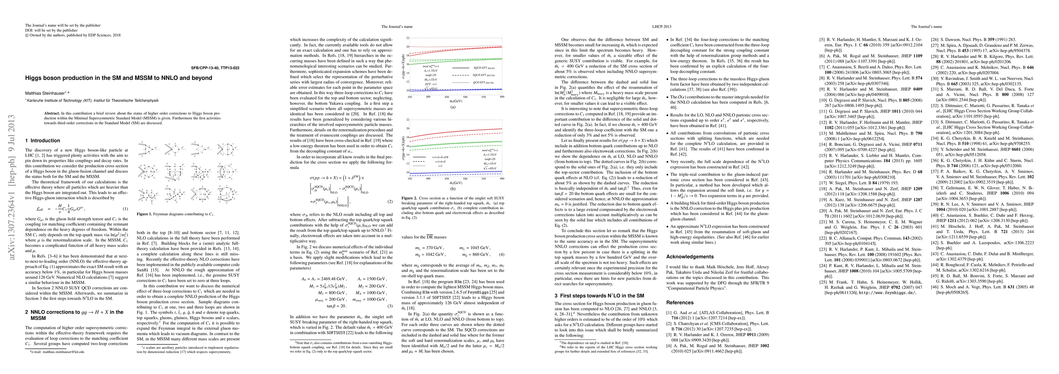 This paper reviews higher-order corrections for Higgs boson production in both the Standard Model (SM) and Minimal Supersymmetric Standard Model (MSSM), and initiates work on third-order corrections in the SM.