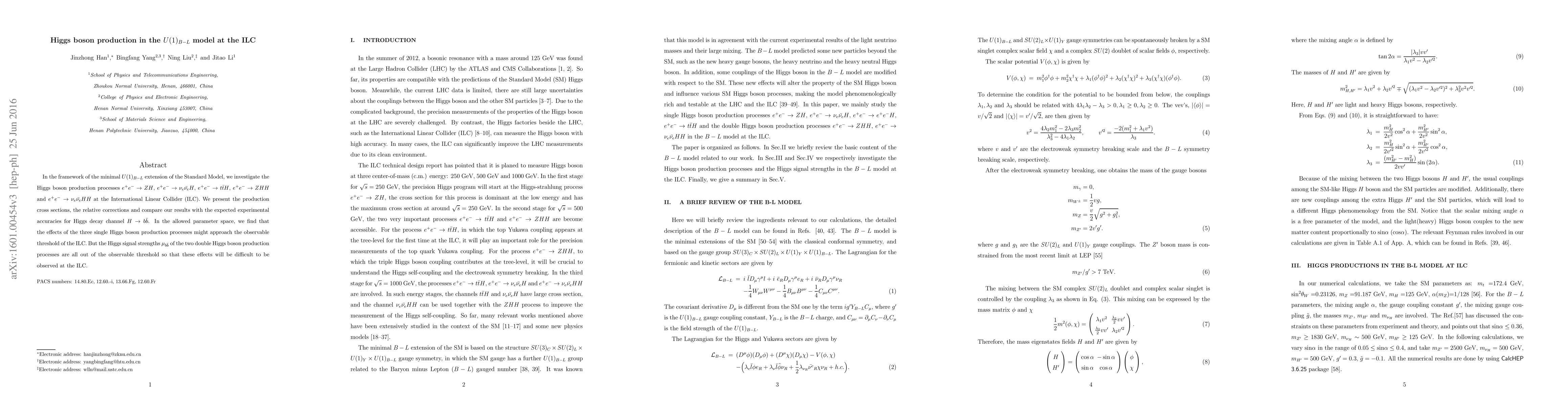 This paper examines Higgs boson production in the minimal $U(1)_{B-L}$ extension of the Standard Model at the International Linear Collider (ILC), focusing on several production processes. The study finds that while some single Higgs production processes may reach the observable threshold, the double Higgs processes are unlikely to be detected due to their signal strengths falling below the observable threshold.