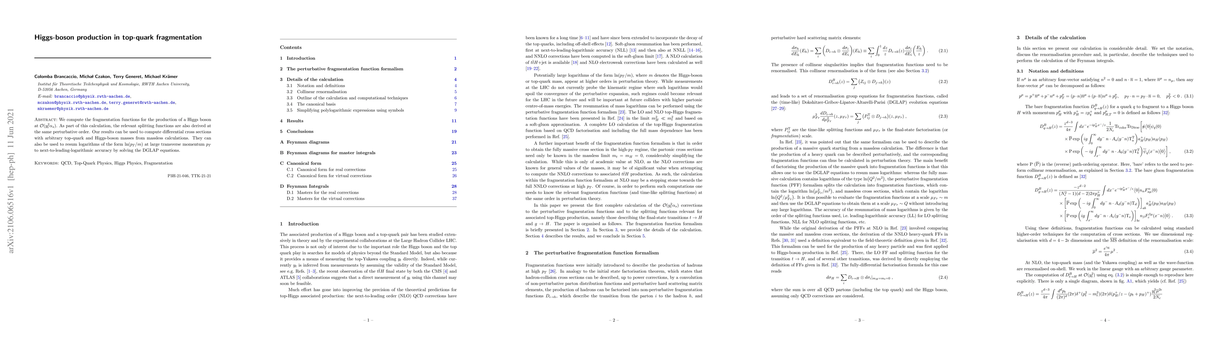 This paper calculates the fragmentation functions for Higgs-boson production via top-quark fragmentation at $\mathcal{O}(y_t^2\alpha_s)$, providing splitting functions at the same order. The results enable the computation of differential cross sections and resum logarithmic terms at large transverse momentum to next-to-leading-logarithmic accuracy.