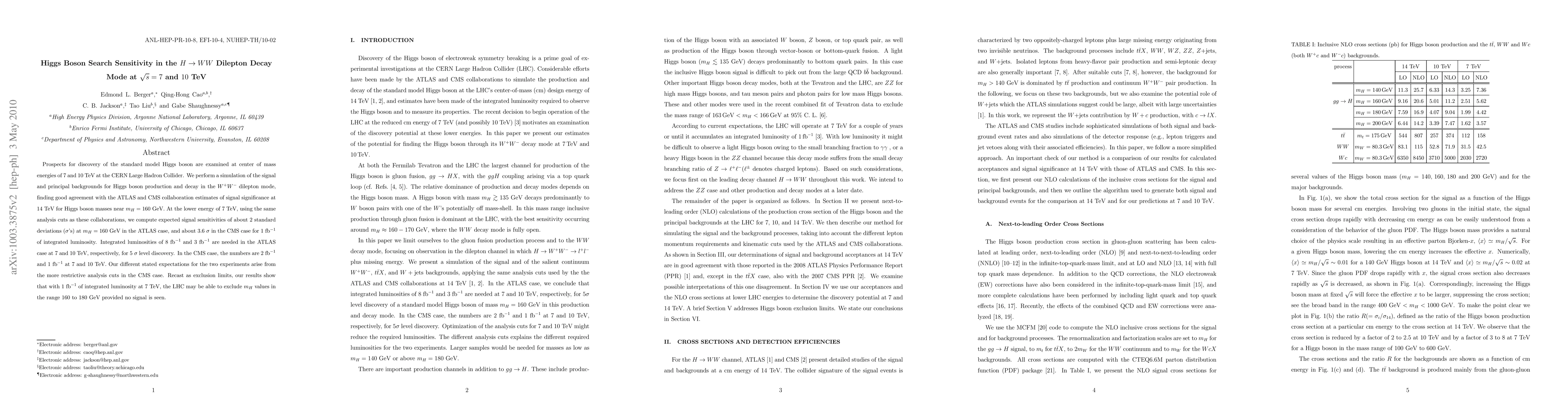 Prospects for discovery of the standard model Higgs boson are examined at center of mass energies of $7$ and $10$ TeV at the CERN Large Hadron Collider. We perform a simulation of the signal and principal backgrounds for Higgs boson production and decay in the $W^+ W^-$ dilepton mode, finding good agreement with the ATLAS and CMS collaboration estimates of signal significance at 14 TeV for Higgs boson masses near $m_H = 160$~GeV. At the lower energy of $7$~TeV, using the same analysis cuts as these collaborations, we compute expected signal sensitivities of about $2$ standard deviations ($\sigma$'s) at $m_H = 160$~GeV in the ATLAS case, and about 3.6~$\sigma$ in the CMS case for $1$~fb$^{-1}$ of integrated luminosity. Integrated luminosities of 8~$\rm{fb}^{-1}$ and 3~$\rm{fb}^{-1}$ are needed in the ATLAS case at $7$ and $10$~TeV, respectively, for $5~\sigma$ level discovery. In the CMS case, the numbers are 2~$\rm{fb}^{-1}$ and 1~$\rm{fb}^{-1}$ at $7$ and $10$~TeV. Our different stated expectations for the two experiments arise from the more restrictive analysis cuts in the CMS case. Recast as exclusion limits, our results show that with $1~{\rm fb}^{-1}$ of integrated luminosity at 7~TeV, the LHC may be able to exclude $m_H$ values in the range 160 to 180~GeV provided no signal is seen.