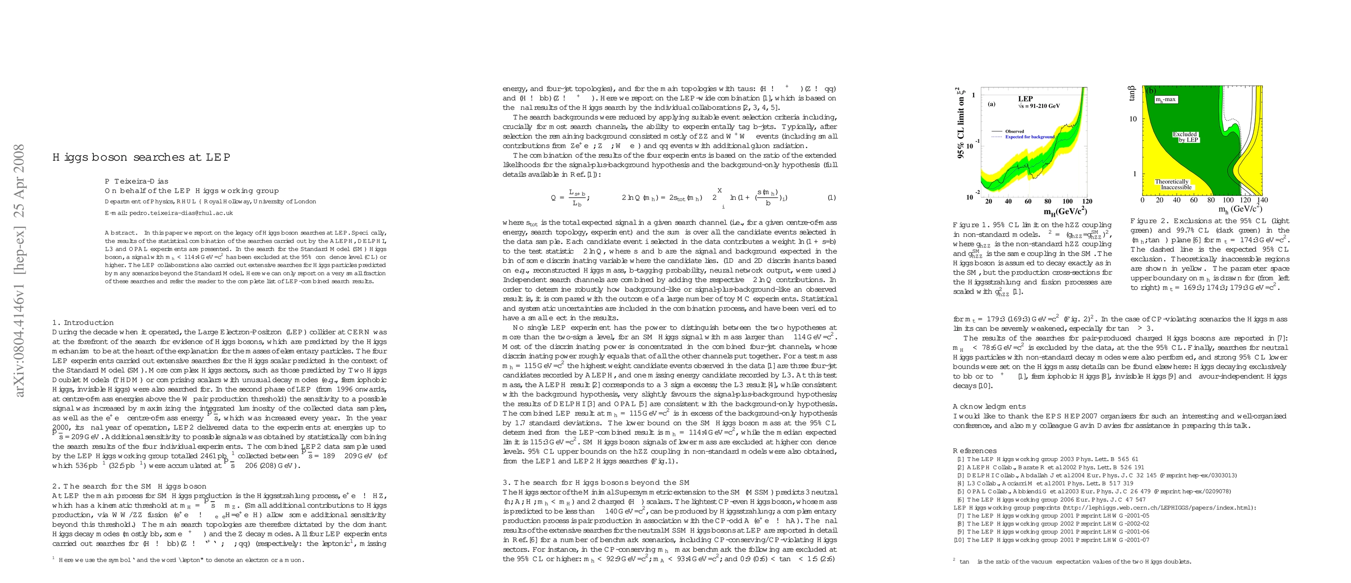 The research methodology involved a statistical combination of Higgs boson search results from the ALEPH, DELPHI, L3, and OPAL experiments at LEP, analyzing data collected at center-of-mass energies up to 209 GeV.
