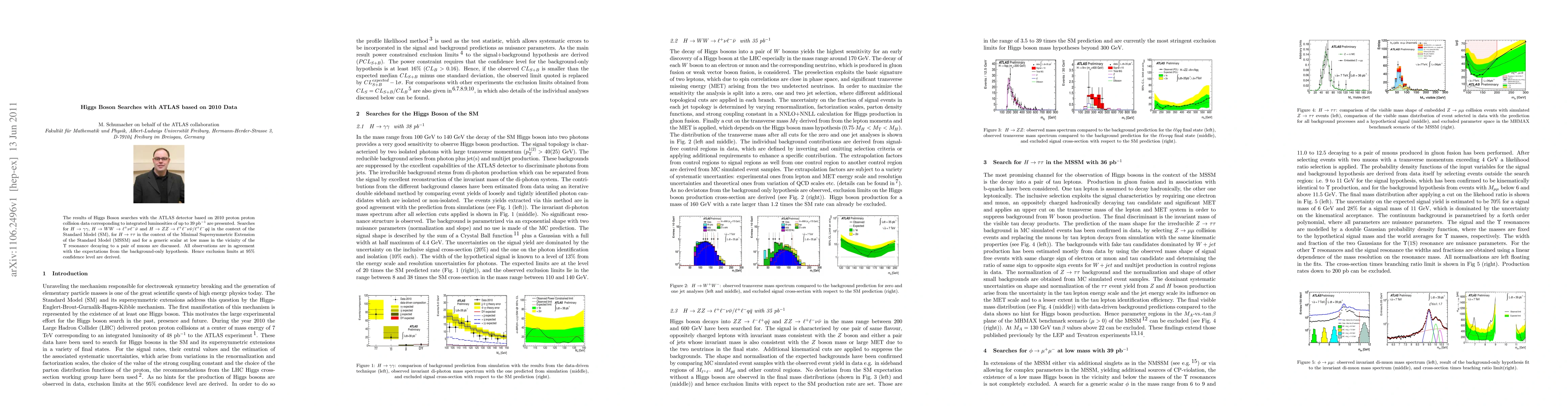 The ATLAS detector searched for the Higgs boson using 2010 proton-proton collision data, finding no evidence of its existence in various channels, with exclusion limits set at a 95% confidence level.