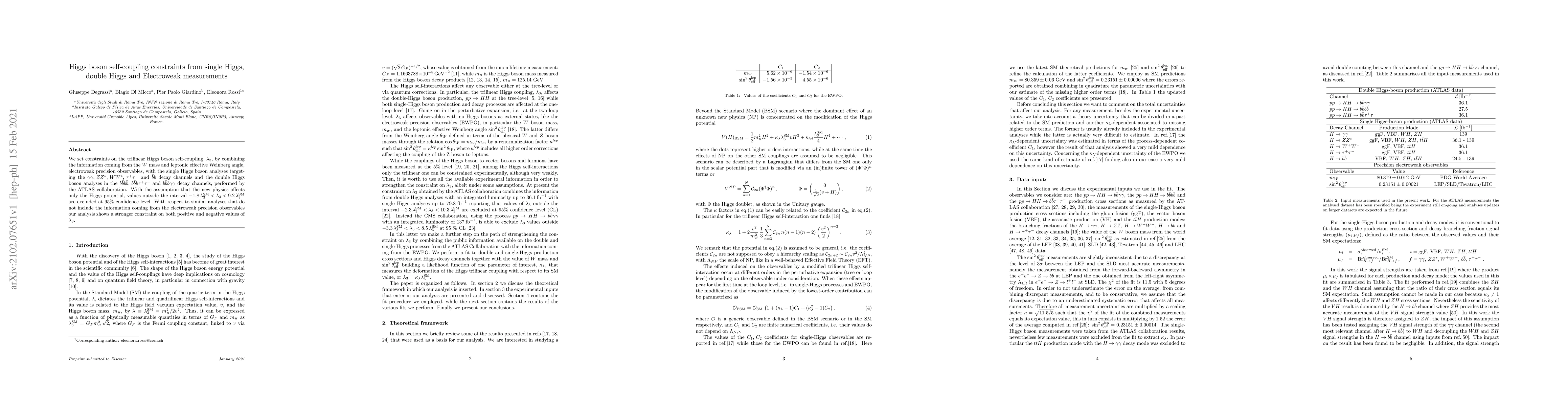 This paper provides constraints on the trilinear Higgs boson self-coupling, $\lambda_3$, by integrating data from single and double Higgs boson analyses, alongside electroweak precision measurements. The analysis excludes values of $\lambda_3$ outside the interval $-1.8 \lambda_3^{\rm SM} < \lambda_3 < 9.2 \lambda_3^{\rm SM}$ at 95% confidence level, showing stronger constraints than previous analyses that did not include electroweak precision data.