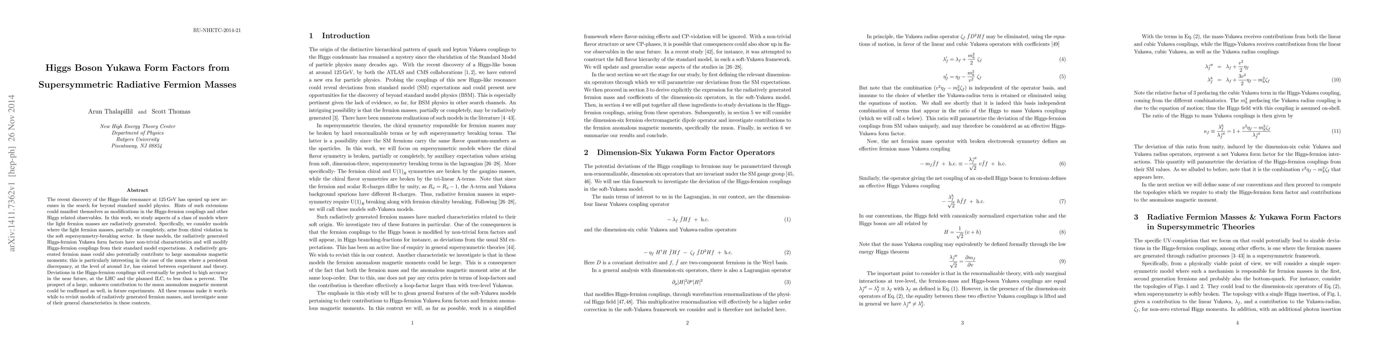 The recent discovery of the Higgs-like resonance at $125\,\rm{GeV}$ has opened up new avenues in the search for beyond standard model physics. Hints of such extensions could manifest themselves as modifications in the Higgs-fermion couplings and other Higgs related observables. In this work, we study aspects of a class of models where the light fermion masses are radiatively generated. Specifically, we consider models where the light fermion masses, partially or completely, arise from chiral violation in the soft supersymmetry-breaking sector. In these models, the radiatively generated Higgs-fermion Yukawa form factors have non-trivial characteristics and will modify Higgs-fermion couplings from their standard model expectations. A radiatively generated fermion mass could also potentially contribute to large anomalous magnetic moments; this is particularly interesting in the case of the muon where a persistent discrepancy, at the level of around $3\,\sigma$, has existed between experiment and theory. Deviations in the Higgs-fermion couplings will eventually be probed to high accuracy in the near future, at the LHC and the planned ILC, to less than a percent. The prospect of a large, unknown contribution to the muon anomalous magnetic moment could be reaffirmed as well, in future experiments. All these reasons make it worthwhile to revisit models of radiatively generated fermion masses, and investigate some of their general characteristics in these contexts.