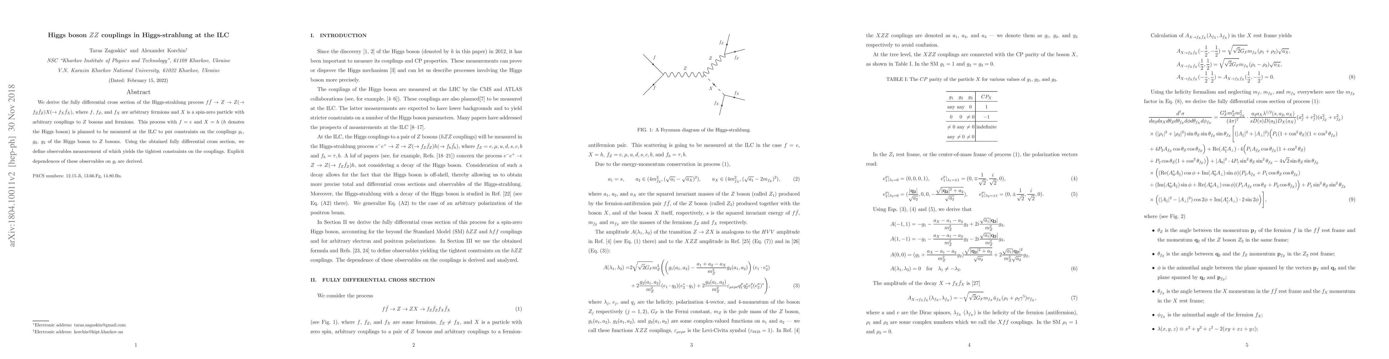 We derive the fully differential cross section of the Higgs-strahlung process $f \bar{f} \to Z \to Z (\to f_Z \bar{f}_Z) X (\to f_X \bar{f}_X)$, where $f$, $f_Z$, and $f_X$ are arbitrary fermions and $X$ is a spin-zero particle with arbitrary couplings to $Z$ bosons and fermions. This process with $f = e$ and $X = h$ ($h$ denotes the Higgs boson) is planned to be measured at the ILC to put constraints on the couplings $g_1$, $g_2$, $g_3$ of the Higgs boson to $Z$ bosons. Using the obtained fully differential cross section, we define observables measurement of which yields the tightest constraints on the couplings. Explicit dependences of these observables on $g_i$ are derived.