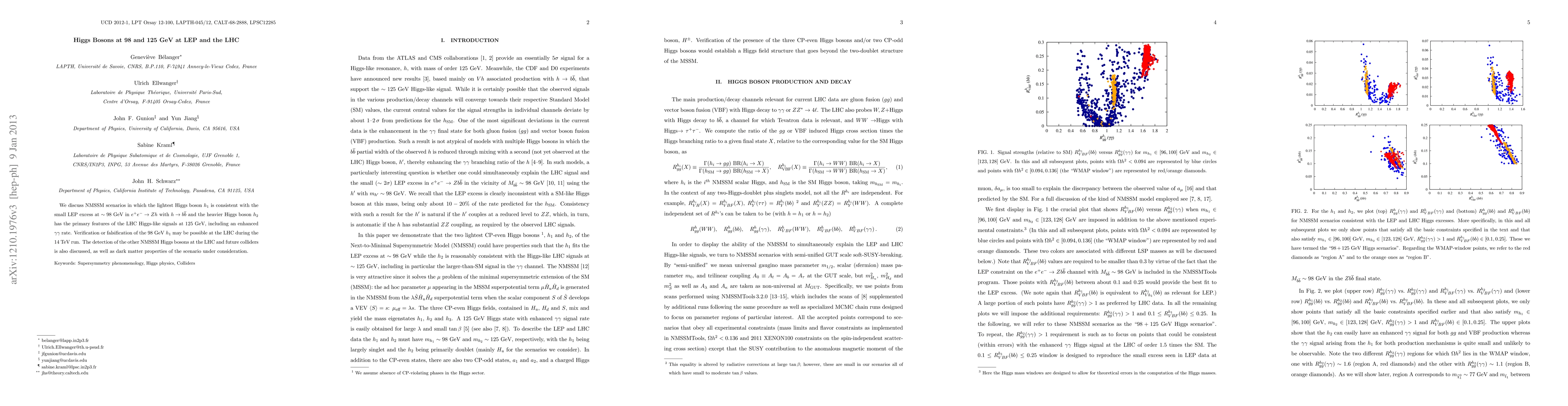 We discuss NMSSM scenarios in which the lightest Higgs boson $h_1$ is consistent with the small LEP excess at about 98 GeV in $e^+e^- \to Zh$ with $h\to b\anti b$ and the heavier Higgs boson $h_2$ has the primary features of the LHC Higgs-like signals at 125 GeV, including an enhanced $\gamma\gamma$ rate. Verification or falsification of the 98 GeV $h_1$ may be possible at the LHC during the 14 TeV run. The detection of the other NMSSM Higgs bosons at the LHC and future colliders is also discussed, as well as dark matter properties of the scenario under consideration.