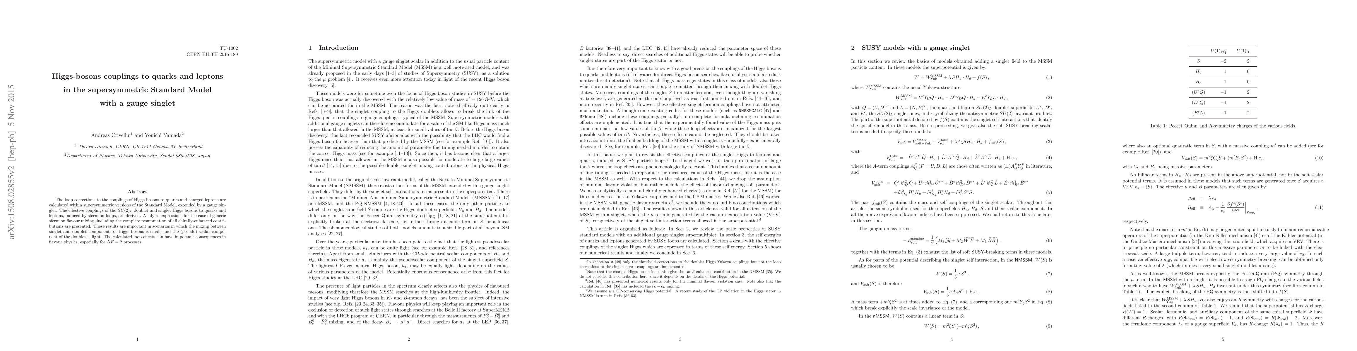 This paper calculates loop corrections to Higgs-boson couplings to quarks and leptons in supersymmetric Standard Models extended by a gauge singlet, deriving effective couplings induced by sfermion loops. The results are crucial for scenarios with minimal mixing between Higgs components and have implications for flavor physics, particularly for $\Delta F=2$ processes.