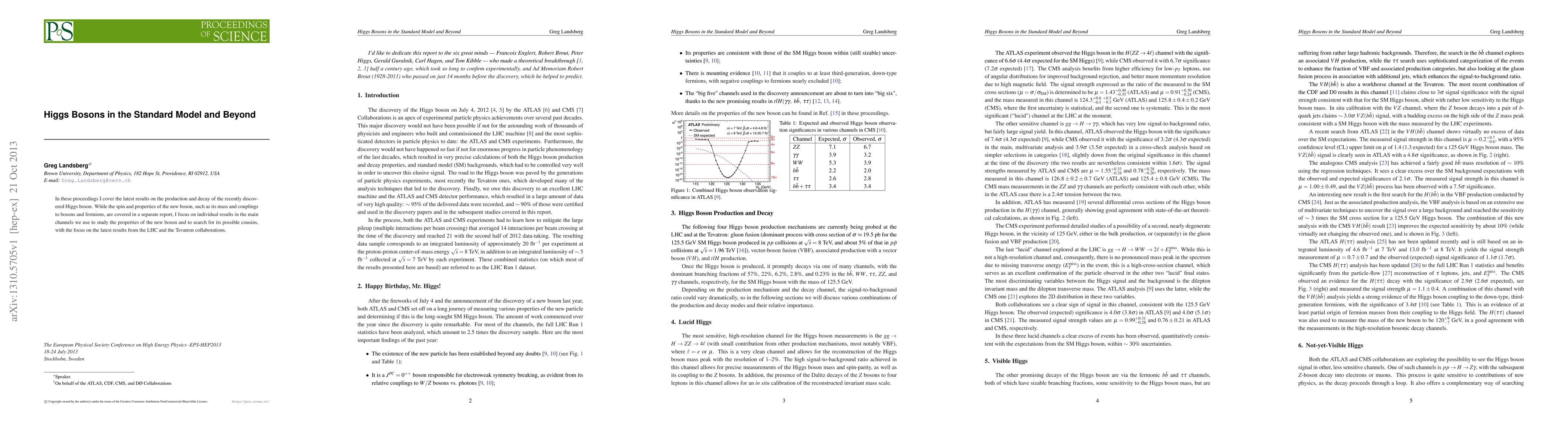 In these proceedings I cover the latest results on the production and decay of the recently discovered Higgs boson. While the spin and properties of the new boson, such as its mass and couplings to bosons and fermions, are covered in a separate report, I focus on individual results in the main channels we use to study the properties of the new boson and to search for its possible cousins, with the focus on the latest results from the LHC and the Tevatron collaborations.