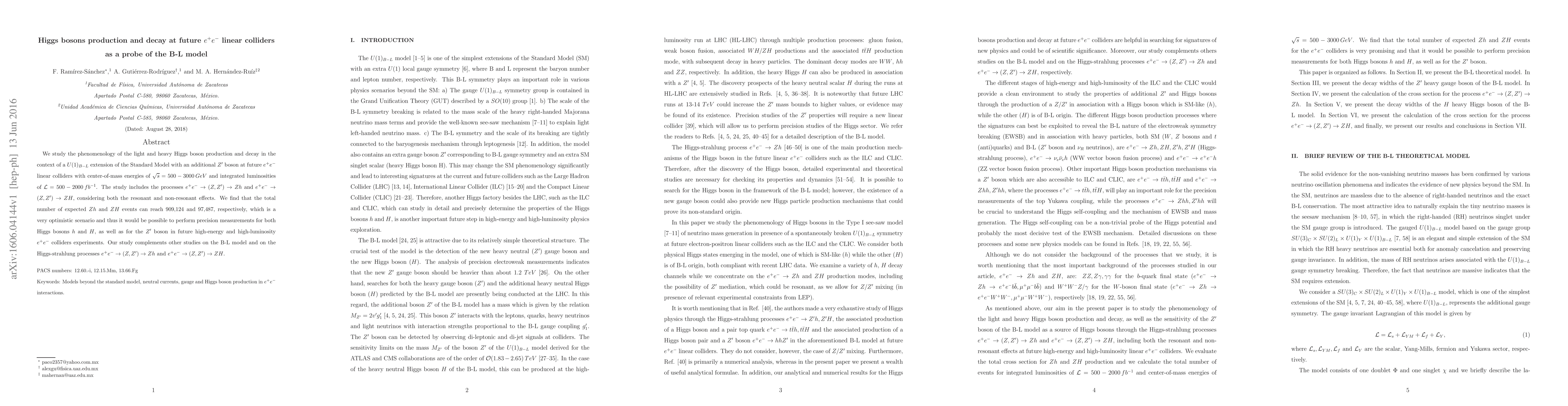 This paper explores the production and decay of light and heavy Higgs bosons in a $U(1)_{B-L}$ extended Standard Model with a $Z'$ boson at future $e^+e^-$ linear colliders, predicting significant event counts that enable precision measurements of Higgs and $Z'$ bosons. The study highlights the potential of these colliders to probe the B-L model through Higgs-strahlung processes.