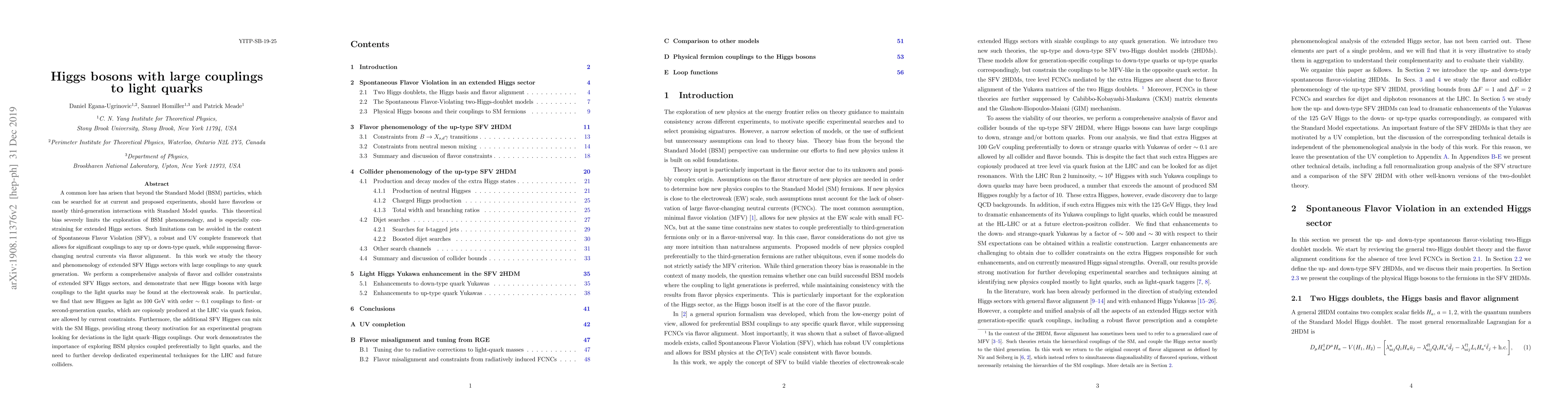 A common lore has arisen that beyond the Standard Model (BSM) particles, which can be searched for at current and proposed experiments, should have flavorless or mostly third-generation interactions with Standard Model quarks. This theoretical bias severely limits the exploration of BSM phenomenology, and is especially constraining for extended Higgs sectors. Such limitations can be avoided in the context of Spontaneous Flavor Violation (SFV), a robust and UV complete framework that allows for significant couplings to any up or down-type quark, while suppressing flavor-changing neutral currents via flavor alignment. In this work we study the theory and phenomenology of extended SFV Higgs sectors with large couplings to any quark generation. We perform a comprehensive analysis of flavor and collider constraints of extended SFV Higgs sectors, and demonstrate that new Higgs bosons with large couplings to the light quarks may be found at the electroweak scale. In particular, we find that new Higgses as light as 100 GeV with order $\sim$ 0.1 couplings to first or second generation quarks, which are copiously produced at LHC via quark fusion, are allowed by current constraints. Furthermore, the additional SFV Higgses can mix with the SM Higgs, providing strong theory motivation for an experimental program looking for deviations in the light quark-Higgs couplings. Our work demonstrates the importance of exploring BSM physics coupled preferentially to light quarks, and the need to further develop dedicated experimental techniques for the LHC and future colliders.