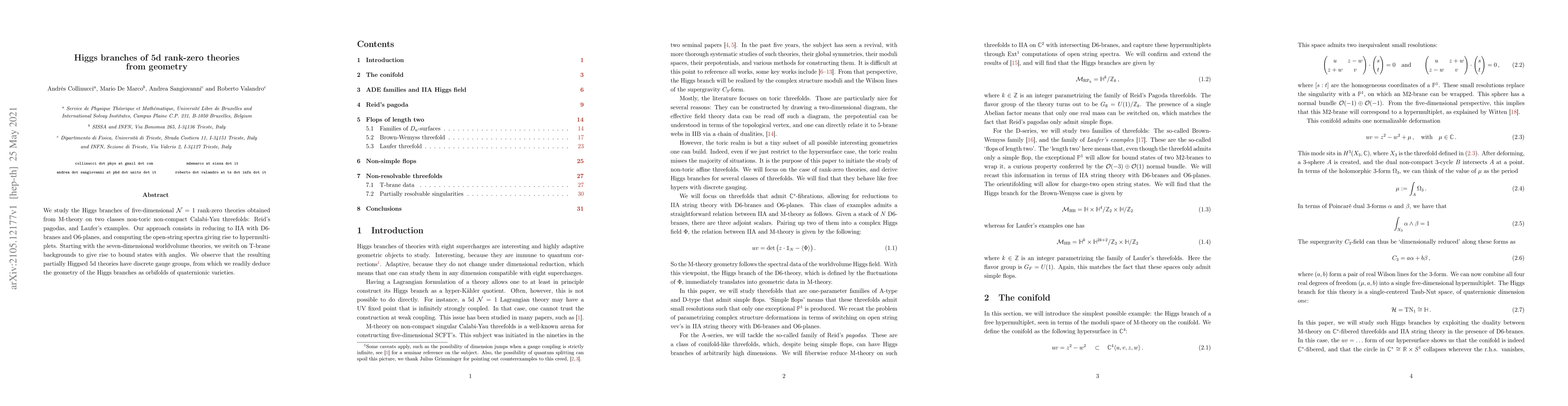 We study the Higgs branches of five-dimensional N=1 rank-zero theories obtained from M-theory on two classes non-toric non-compact Calabi-Yau threefolds: Reid's pagodas, and Laufer's examples. Our approach consists in reducing to IIA with D6-branes and O6-planes, and computing the open-string spectra giving rise to hypermultiplets. Starting with the seven-dimensional worldvolume theories, we switch on T-brane backgrounds to give rise to bound states with angles. We observe that the resulting partially Higgsed 5d theories have discrete gauge groups, from which we readily deduce the geometry of the Higgs branches as orbifolds of quaternionic varieties.