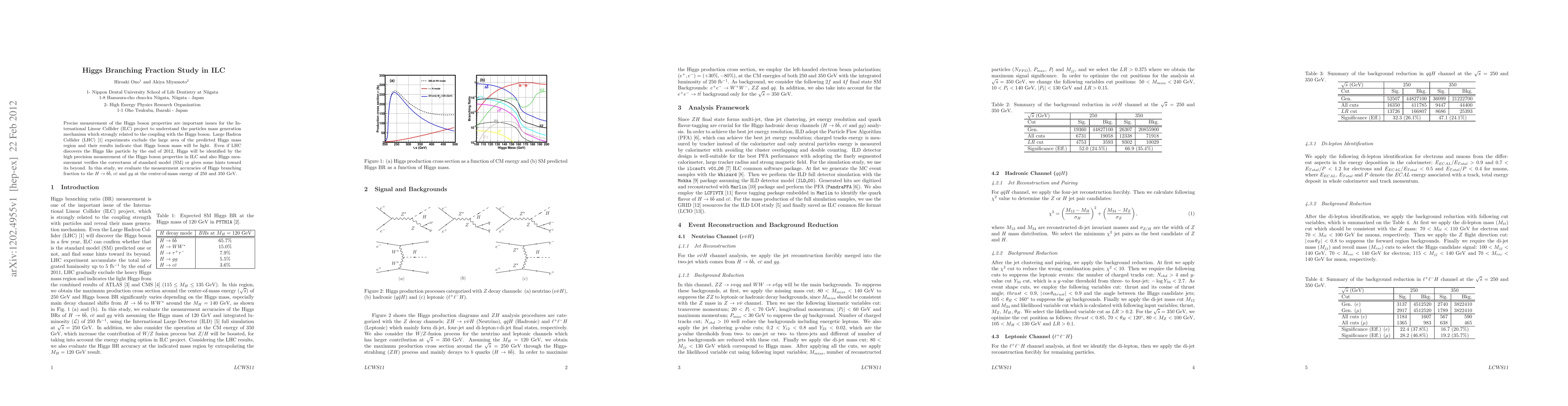 Precise measurement of the Higgs boson properties are important issues for the International Linear Collider (ILC) project to understand the particles mass generation mechanism which strongly related to the coupling with the Higgs boson. Large Hadron Collider (LHC) experiments exclude the large area of the predicted Higgs mass region and their results indicate that Higgs boson mass will be light. Even if LHC discovers the Higgs like particle by the end of 2012, Higgs will be identified by the high precision measurement of the Higgs boson properties in ILC and also Higgs measurement verifies the correctness of standard model (SM) or gives some hints toward its beyond. In this study, we evaluate the measurement accuracies of Higgs branching fraction to the H->bb, cc and gg at the center-of-mass energy of 250 and 350 GeV.