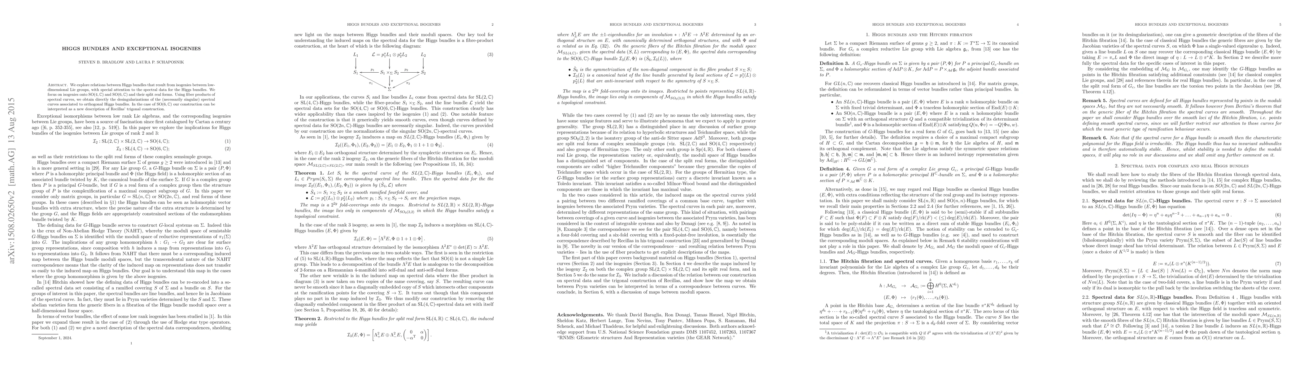 This paper investigates the connections between Higgs bundles derived from isogenies between low-dimensional Lie groups, particularly focusing on spectral data for these bundles. The study highlights desingularizations of spectral curves for orthogonal Higgs bundles via fiber products, and introduces a new perspective on Recillas' trigonal construction for $SO(6,C)$.