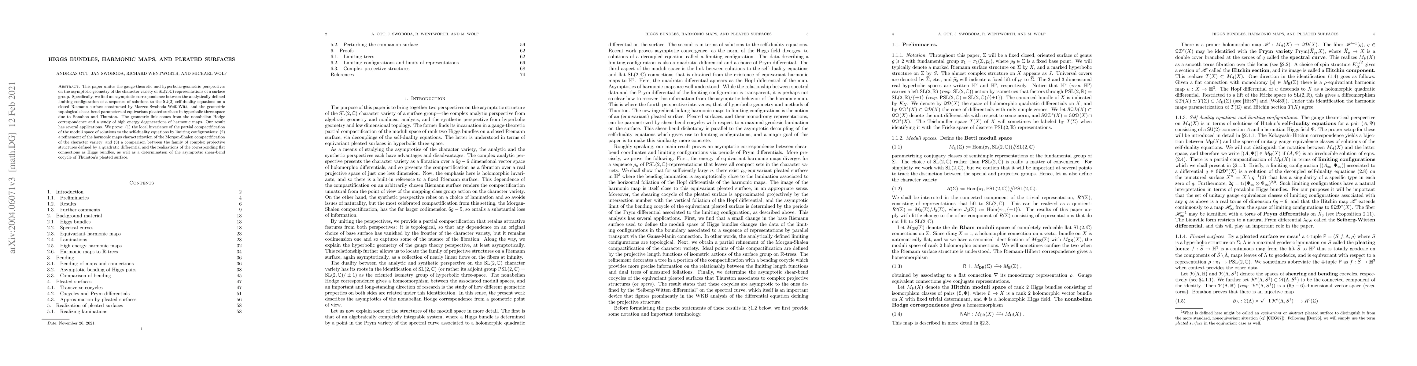 This paper unites the gauge-theoretic and hyperbolic-geometric perspectives on the asymptotic geometry of the character variety of SL(2,C) representations of a surface group. Specifically, we find an asymptotic correspondence between the analytically defined limiting configuration of a sequence of solutions to the SU(2) self-duality equations on a closed Riemann surface constructed by Mazzeo-Swoboda-Weiss-Witt, and the geometric topological shear-bend parameters of equivariant pleated surfaces in hyperbolic three-space due to Bonahon and Thurston. The geometric link comes from the nonabelian Hodge correspondence and a study of high energy degenerations of harmonic maps. Our result has several applications. We prove: (1) the local invariance of the partial compactification of the moduli space of solutions to the self-duality equations by limiting configurations; (2) a refinement of the harmonic maps characterization of the Morgan-Shalen compactification of the character variety; and (3) a comparison between the family of complex projective structures defined by a quadratic differential and the realizations of the corresponding flat connections as Higgs bundles, as well as a determination of the asymptotic shear-bend cocycle of Thurston's pleated surface.