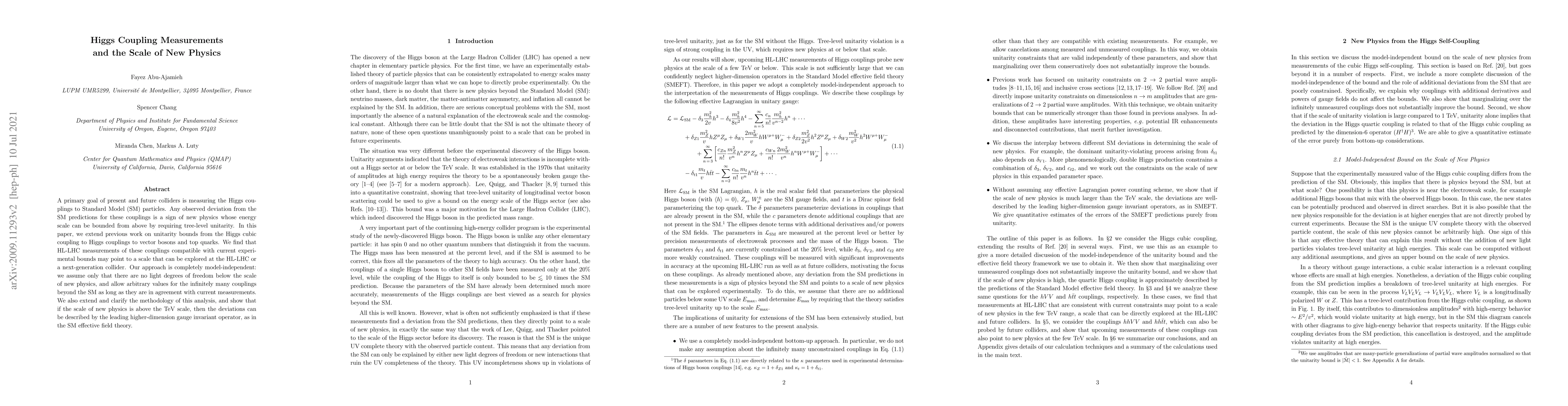 This paper investigates the potential for new physics beyond the Standard Model by measuring the Higgs couplings to vector bosons and top quarks, extending previous unitarity bounds. It finds that HL-LHC measurements could indicate a new physics scale accessible at the HL-LHC or a next-generation collider, employing a model-independent approach.