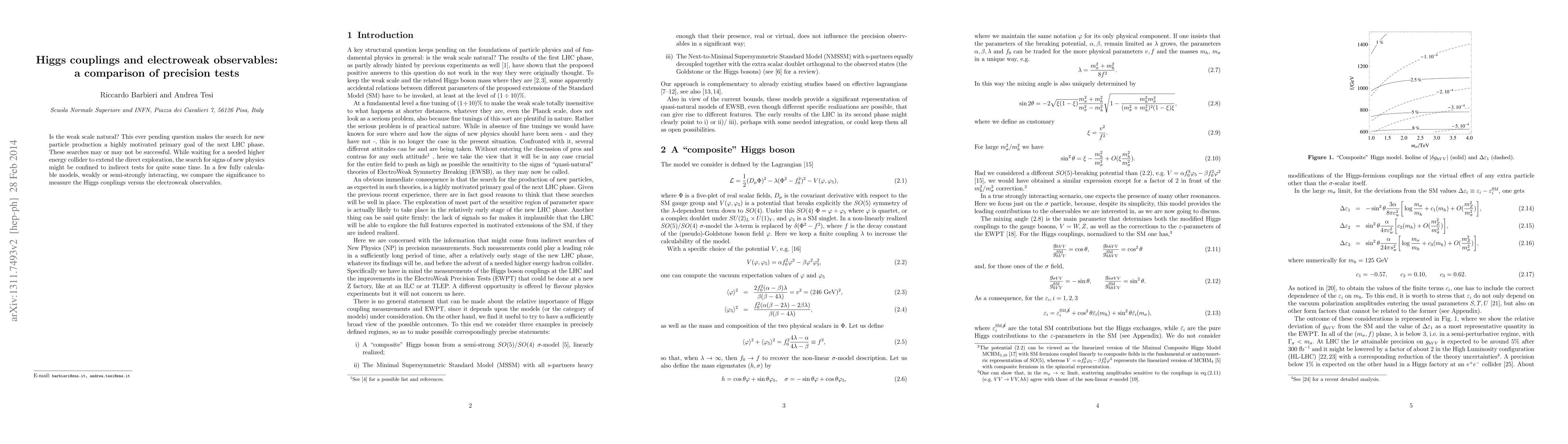 Is the weak scale natural? This ever pending question makes the search for new particle production a highly motivated primary goal of the next LHC phase. These searches may or may not be successful. While waiting for a needed higher energy collider to extend the direct exploration, the search for signs of new physics might be confined to indirect tests for quite some time. In a few fully calculable models, weakly or semi-strongly interacting, we compare the significance to measure the Higgs couplings versus the electroweak observables.